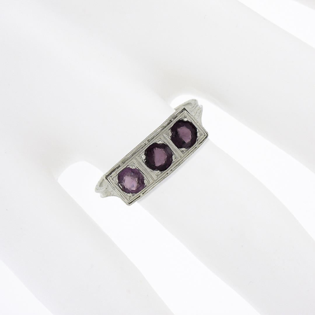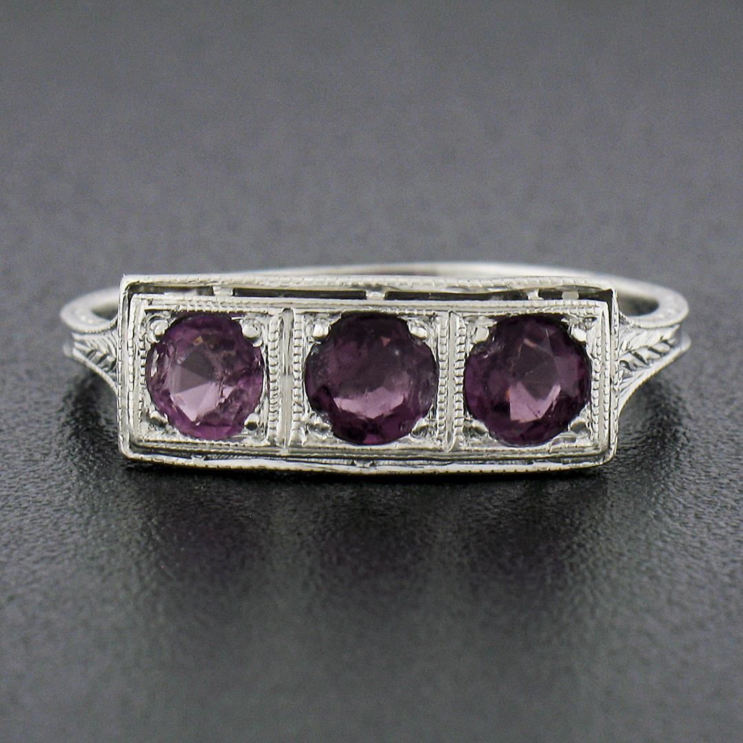 An antique solid platinum 3 stones ring, with 3 old cut natural rhodolite garnets. The ring is size 8.0, weighs a total of 3.03 grams, and measures 6.3mm wide.