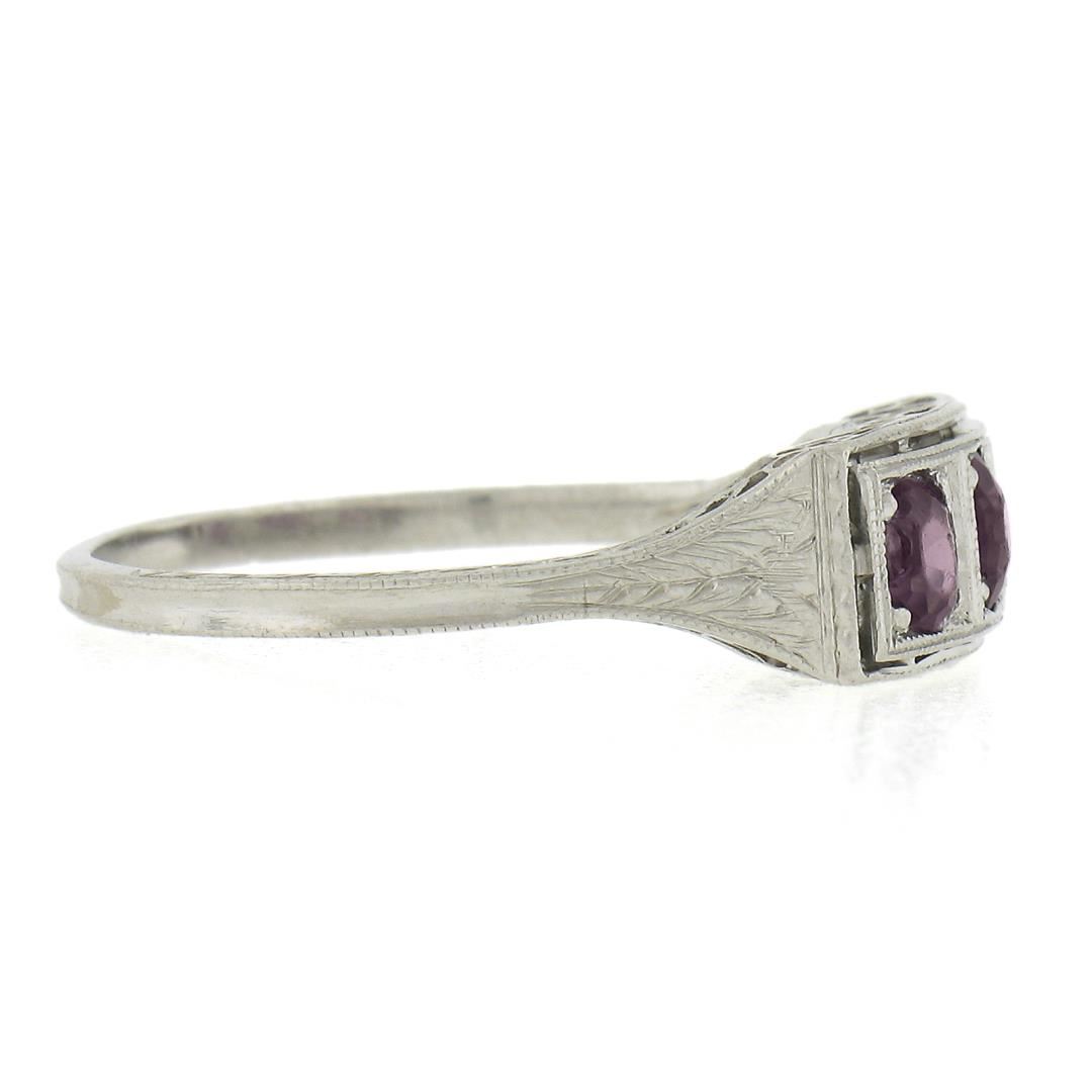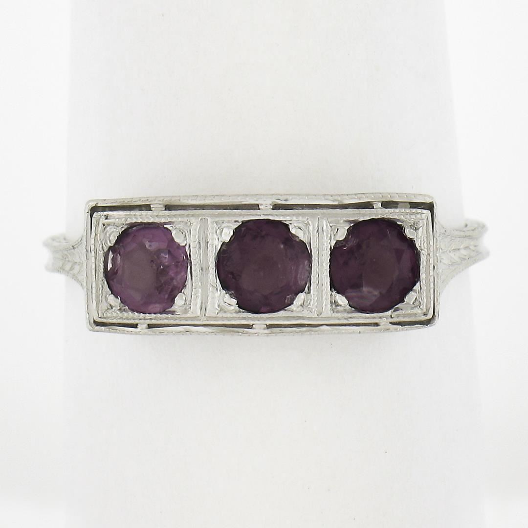 An antique solid platinum 3 stones ring, with 3 old cut natural rhodolite garnets. The ring is size 8.0, weighs a total of 3.03 grams, and measures 6.3mm wide.