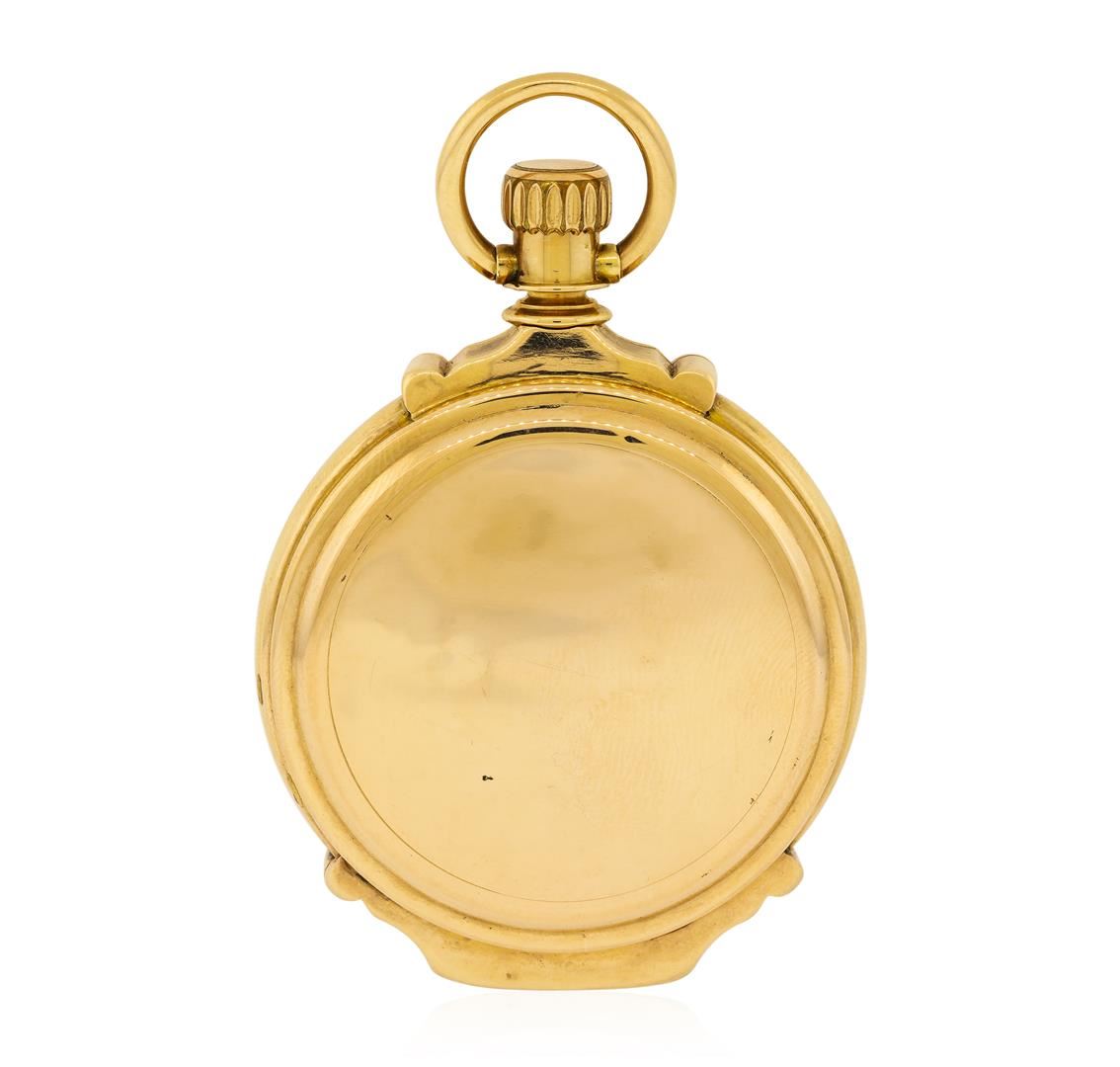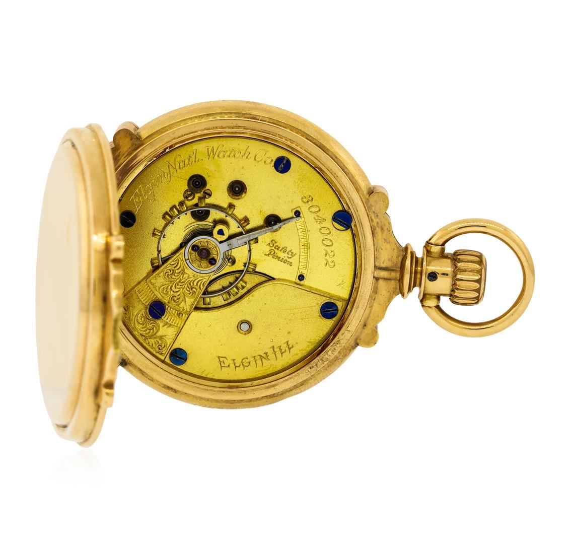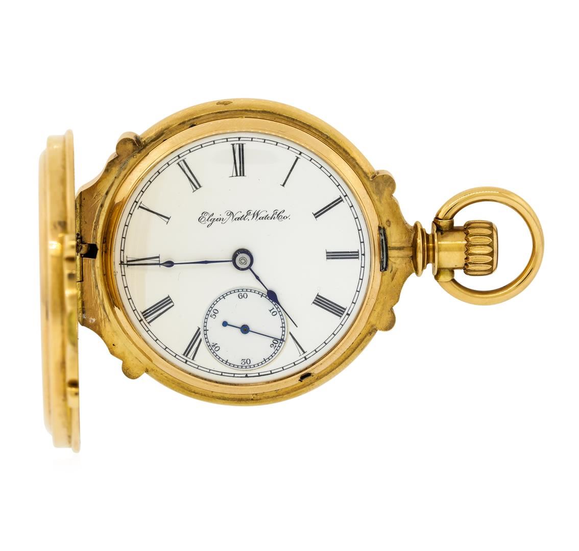 One Elgin antique 14KT Rose Gold Pocketwatch. Movement: Elgin mechanical with manual winding, serial number 3040022. Case: Hunter, 14KT Rose Gold, measures 54mm in diameter, case number A11501. Case signed "14K". Dial: White enamel with painted Roman numerals and blued steel hands. Seconds sub-dial is located at 6 o'clock. Condition: G-4 FINE, (good working order and good condition). Total Weight of Watch: 157.00gm.