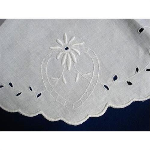 BEAUTIFUL LARGE ROUND CENTER PIECE, WHITE MADEIRA WITH WHITE EMBROIDERY,CUTWORK AND SCALLOPED EDGES, DEPICTING LOVELY HEARTS AND FLOWERS, ALL HAND MADE AND IN EXCELLENT CONDITION FREE OF HOLES OR STAINS,MEASURING ABOUT 19 1/4" IN DIAM.USBuyer to pay 4.00 for shipping plus insurance.THANKS.