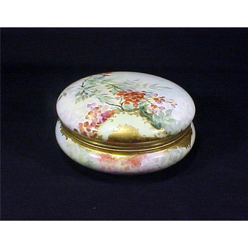 Here is a very nice 19th century large size T&V Limoges powder jar. It is hand painted in lovely yet vibrant colors. I?m assuming that this is cherry tree design and along the top and bottom edge of the lid it has a lavish amount of gold gilding. The powder jar is in very fine condition having only one minute, and I mean minute, tiny flake on the interior of the rim of the part that sits down into the bowl. Otherwise it is in absolutely perfect condition. The T&V Limoges mark appears in the Encyclopedia of Limoges book as mark number 7 ? the mark is in green with the initials T&V Limoges France and this mark dates between 1892-1907. Overall it measures 7? in diameter and it is 3 ¼? at highest.