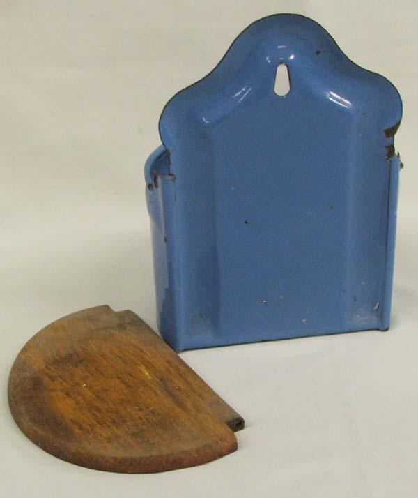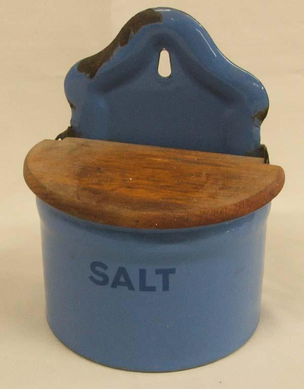Antique Enamelware Salt Box. Measures approx. 7 1/2''H x 5 3/4'' x 4''. Some chipping. Buyers Pay Actual Shipping and Handling Charges(see terms and conditions for more information).