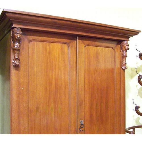 This exceptional teakwood linen press dates from circa 1860. Recently refinished and restored to its original glory. Measures 55" wide by 79" high by 30" deep. Two prominent lion heads adorn the upper right and left sides, and which sit upon a platform adorned at the bottom by an integrated shell and scroll design.