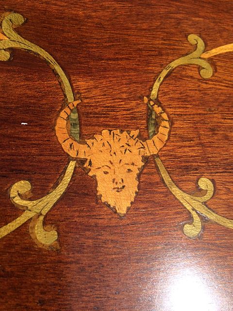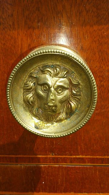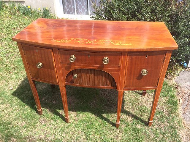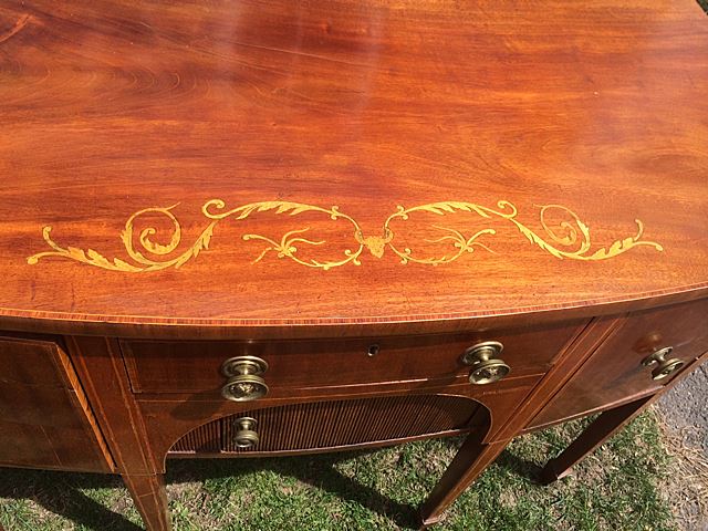 Antique, well over 100 years old, beautiful English Regency miniature size sideboard. Marquetry inlay on top and line inlay, lion's head pulls, tambour roll mechanism on doors. Measures approx. 35" long x 23" deep x 35" tall. Very rare to find one in this size! Beautiful piece to adorn any home, bring this one home for the Holidays!
