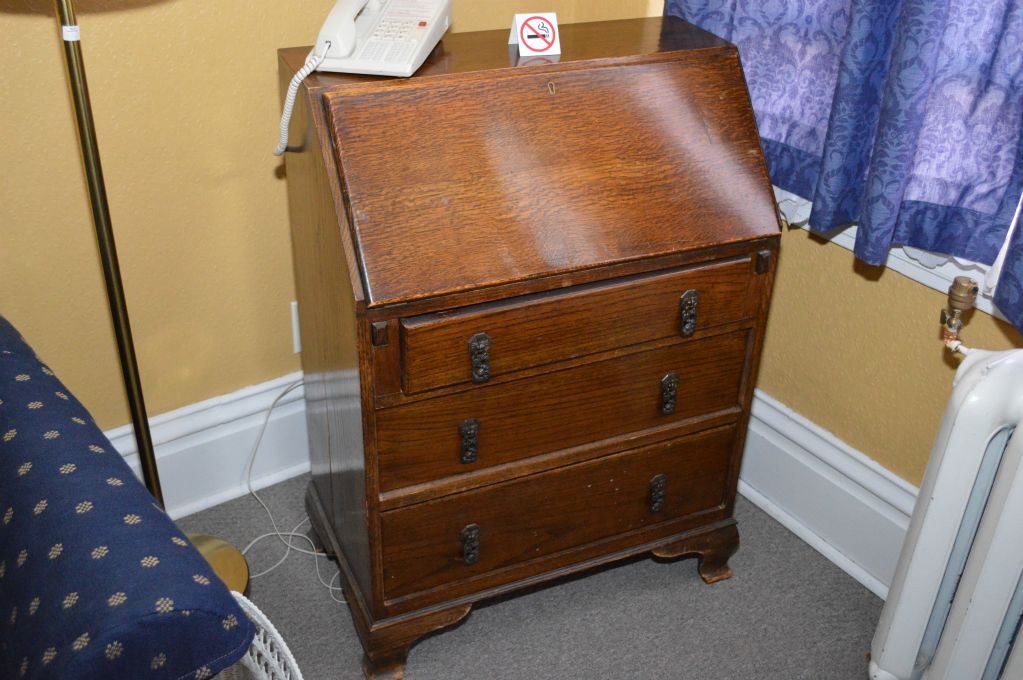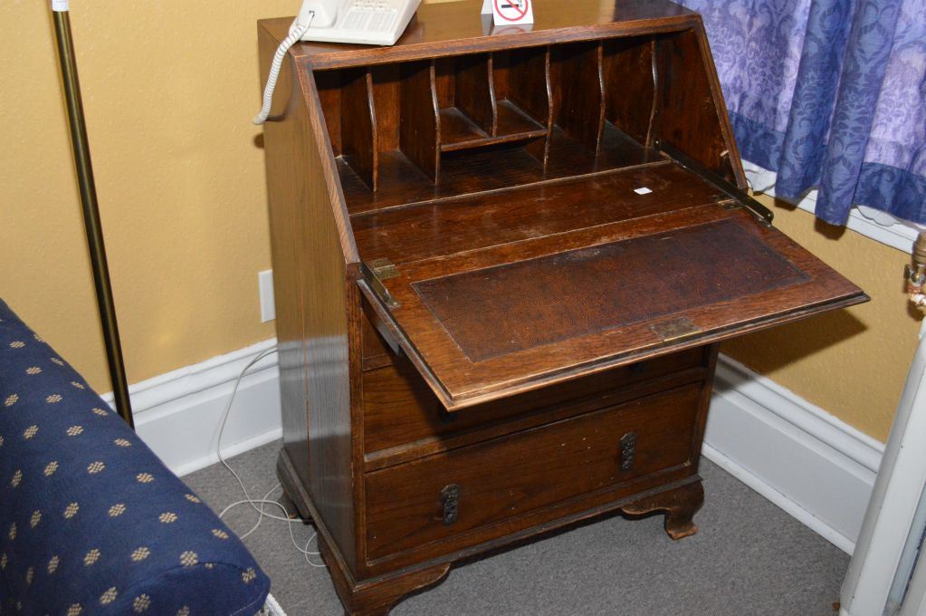 Antique English oak three drawer drop front burrow with pigeon hole interior