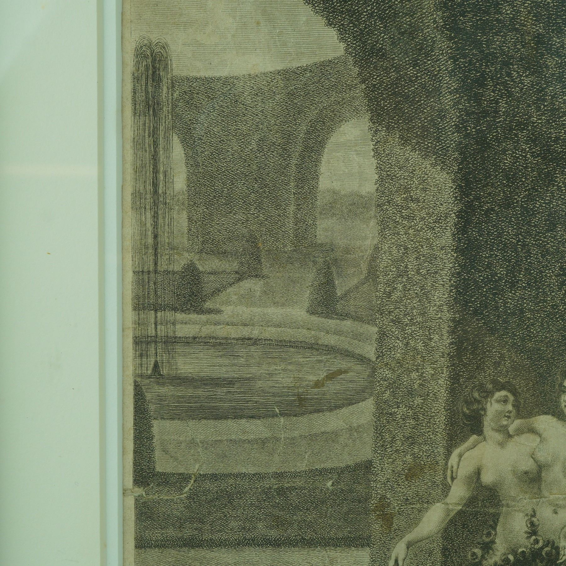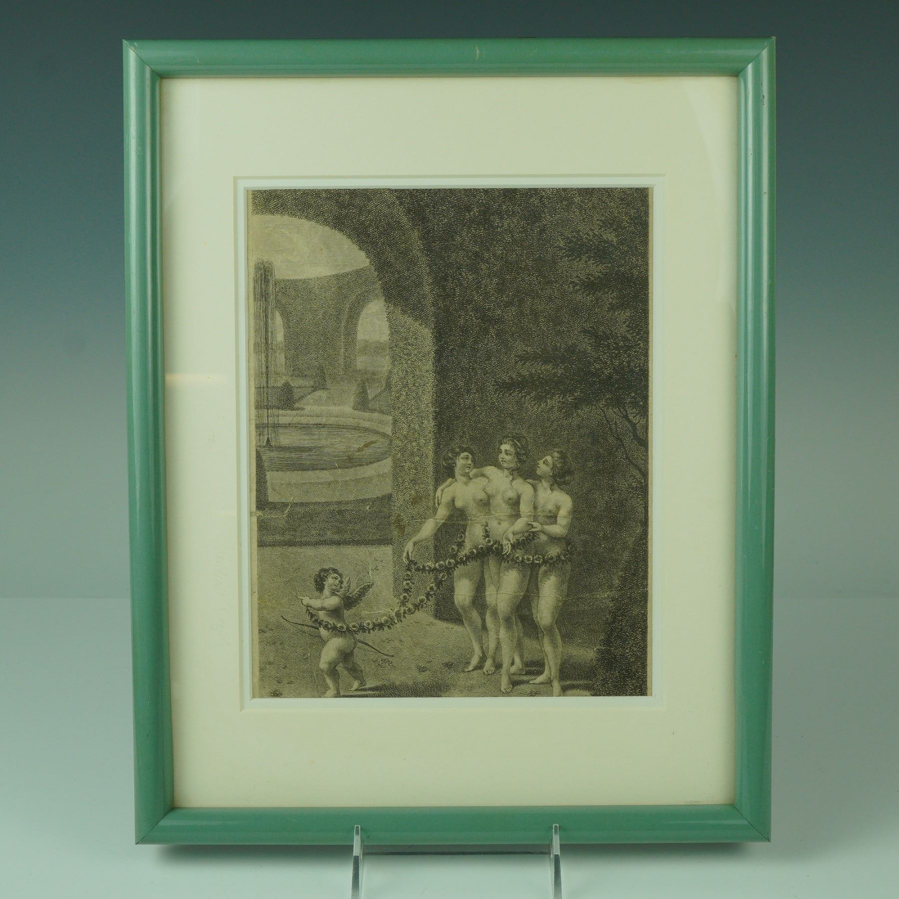 Neoclassical engraving signed "Grave par Jh Maillet" at lower left, likely referring to French engraver Jean-Jacques Maillet, active circa 1790 to 1820. The scene depicts Cupid leading three nude female figures, likely representing the Three Graces, through a garden. The figures are linked by a floral garland, with architectural arches and a fountain in the background. Executed in fine line and stipple engraving, characteristic of late 18th to early 19th century French printmaking. The print shows age-related wear including creases and scattered toning. Framed in a green painted wood frame with matting under glass.