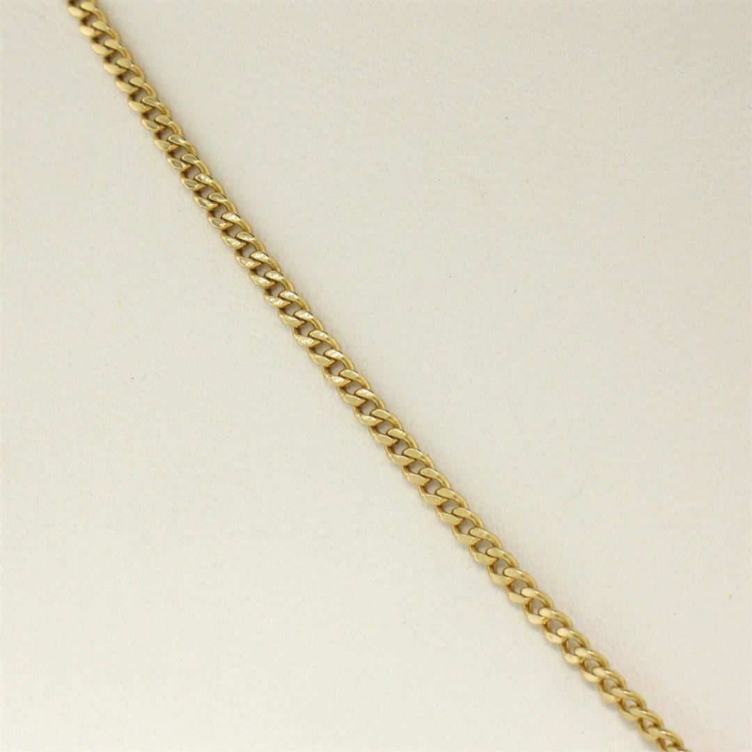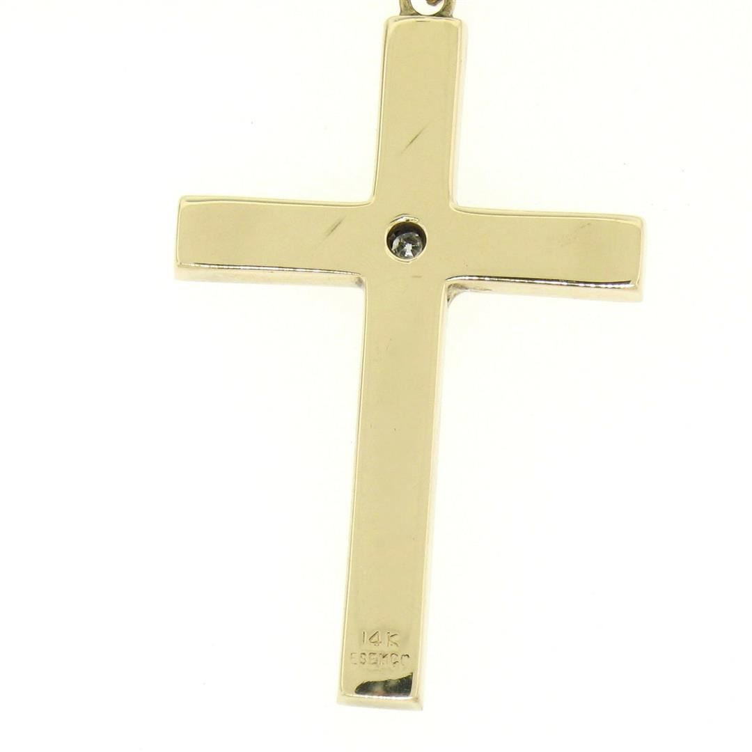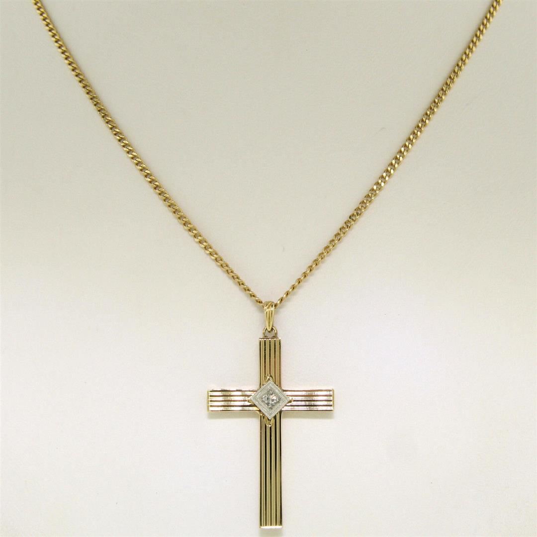 An antique 14kt yellow and white gold cross pendant crafted by Esemco featuring a 0.06ct round single cut diamond (G - VS2). 19 inch fine curb link chain, 5.32 grams total weight, pendant measures 36.30x20.55mm with the bail.
