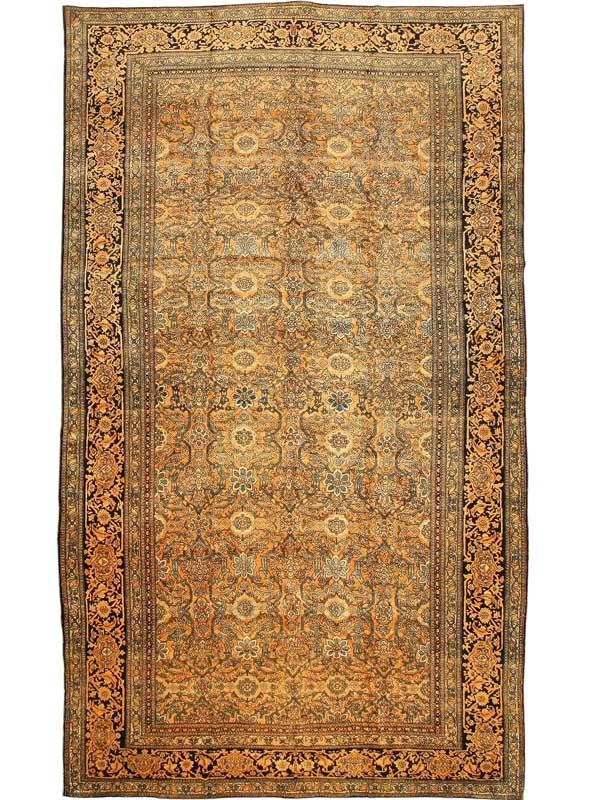 10.03 x 18.00 Circa 1900 Antique Isfahan from Central Persia - Arabesque vines and palmettes in shades of blue undulate in dynamic rhythms across the soft apricot field of this sumptuously elegant antique Isfahan. Their arrangement effectively defines adjacent compartments of differing form in a larger reciprocal pattern. Various palmettes and flowers fill the intervening spaces. The border asserts a bolder contrast with its golden vines against a deep blue ground, which all provides a clear and truly classic Persian framing effect for the overall composition.