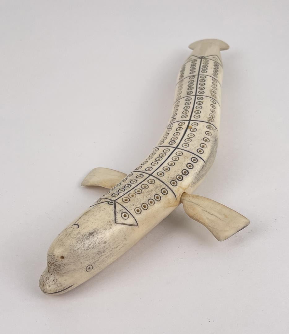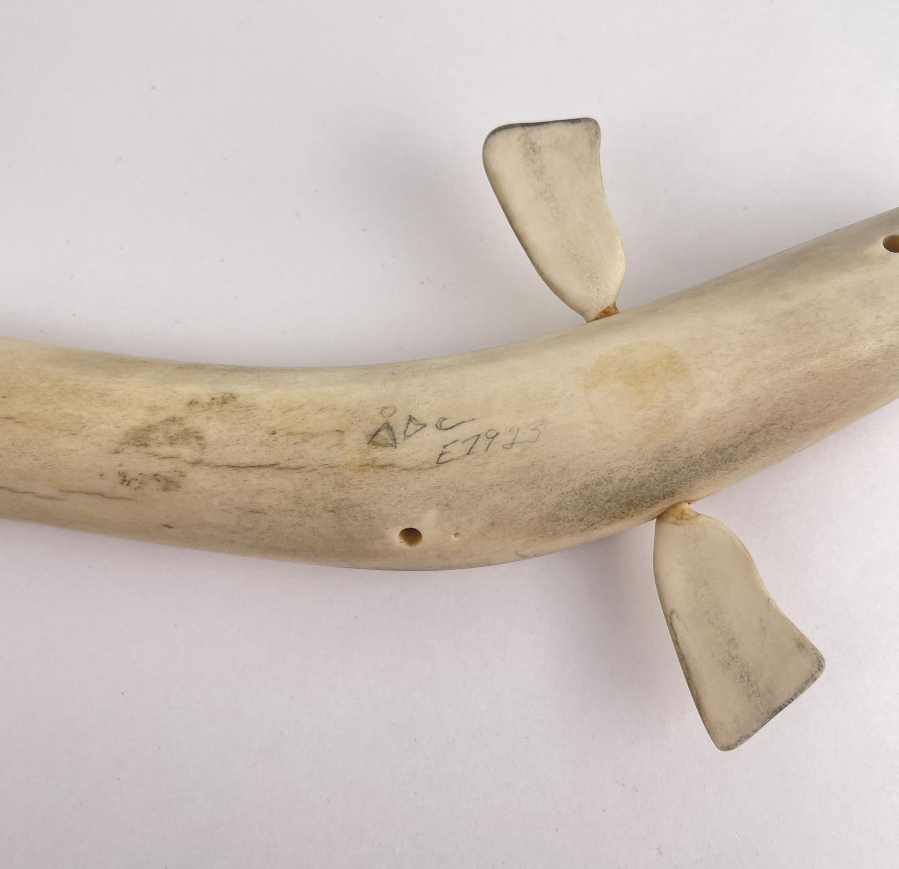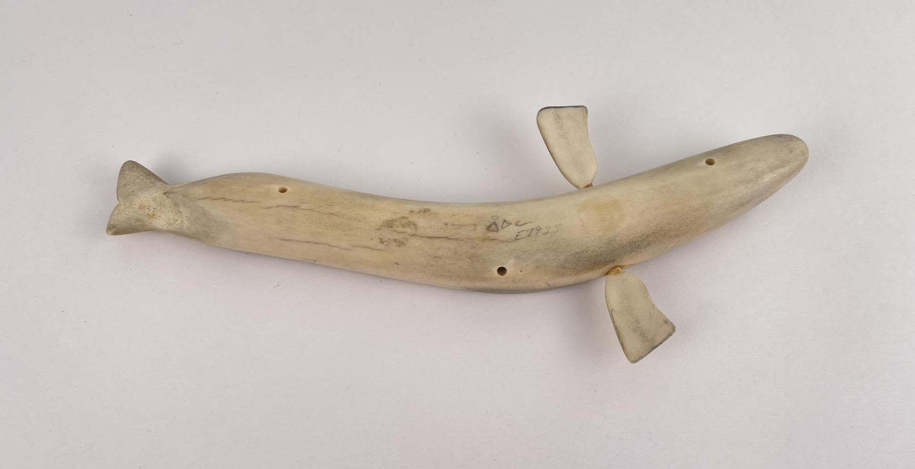 In the form of a Beluga Whale. Made from Antler. Signed with museum collection number on base. 12" long.
