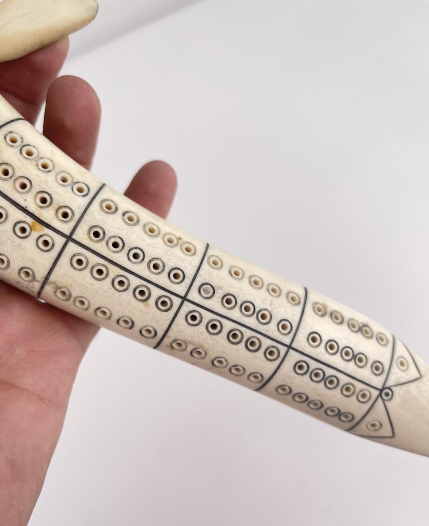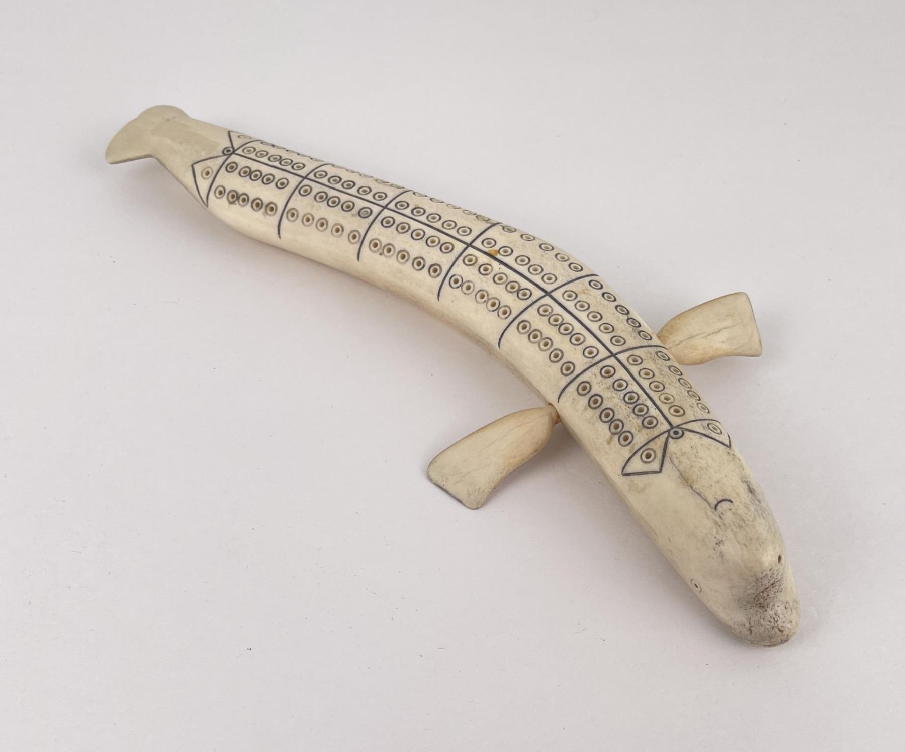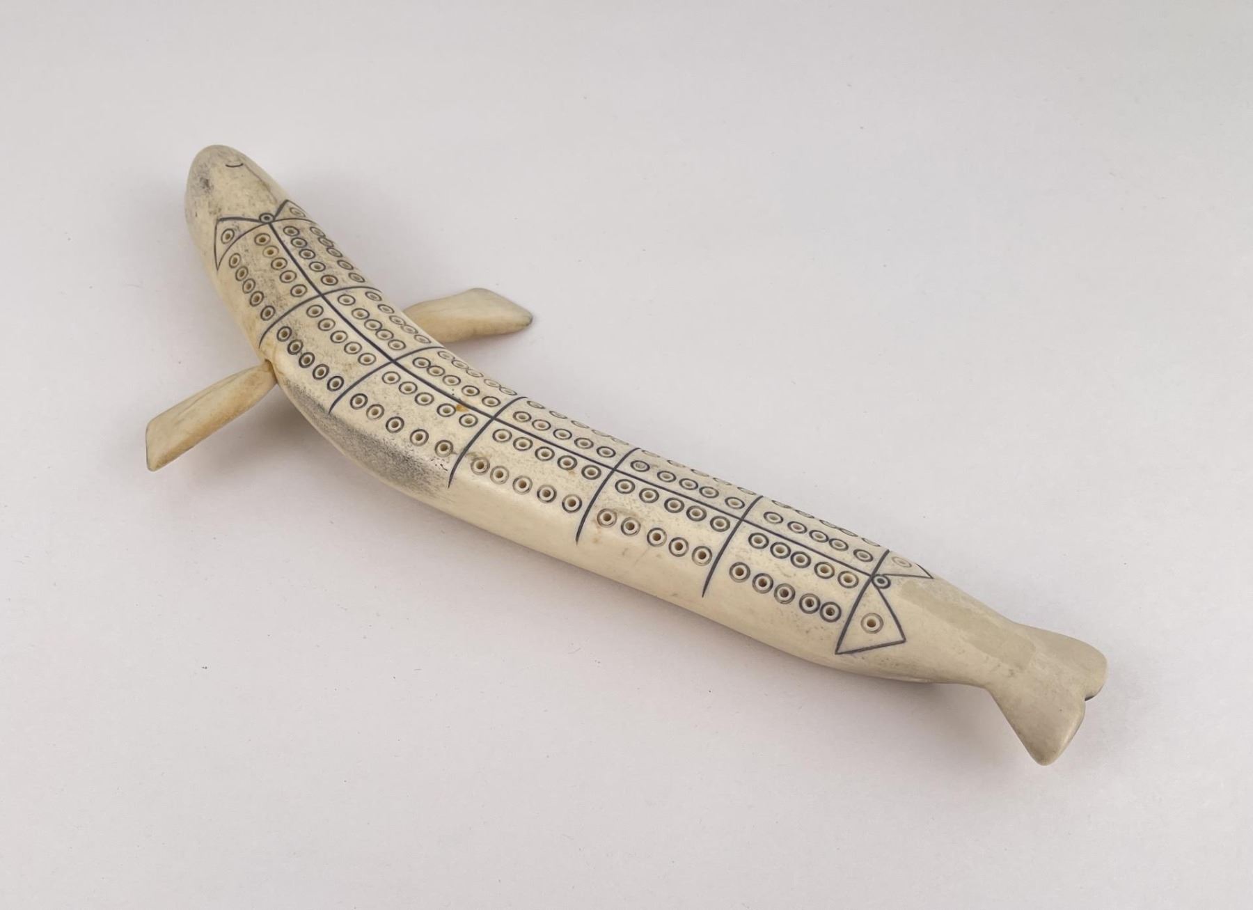 In the form of a Beluga Whale. Made from Antler. Signed with museum collection number on base. 12" long.