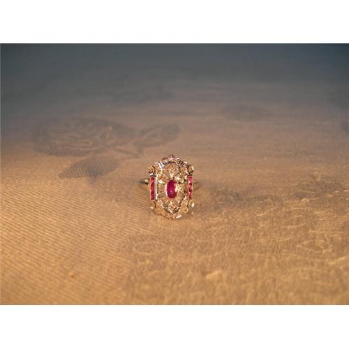 You are looking at an antique 14K white gold ruby and diamond ring. There are 26 round diamonds and one large oval ruby in the center. Also there are 6 princess cut rubies held in the face of the ring. The oval ruby measures 5 mm long by 3 mm wide. All gemstones are natural. The rubies weigh a total of .63 carats and the diamonds weigh .13 carats. The top of the ring measures 1/2 of an inch wide by 3/4 of an inch long. The ring is a size 7. Sizing is available. It weighs 4.2 grams. It is in mint condition