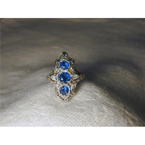 You are looking at an antique estate 18K white gold filigree diamond and sapphire ring. There are 6 brilliant round diamonds along the delicate filigree of this lovely ring. The 3 round natural sapphires vary in measurement from 4 mm to 6 mm in diameter. The top of the ring measures 7/8 of an inch long by 5/8 of an inch wide. This lovely piece retails for over $2500. It is a size 7.25. Sizing is available. This ring weighs 3.6 grams. It is in mint condition. Do not miss out on this great offer! Please check out all of our unique and unusual items. Please email for any questions and thanks for stopping by!