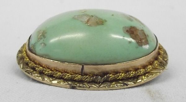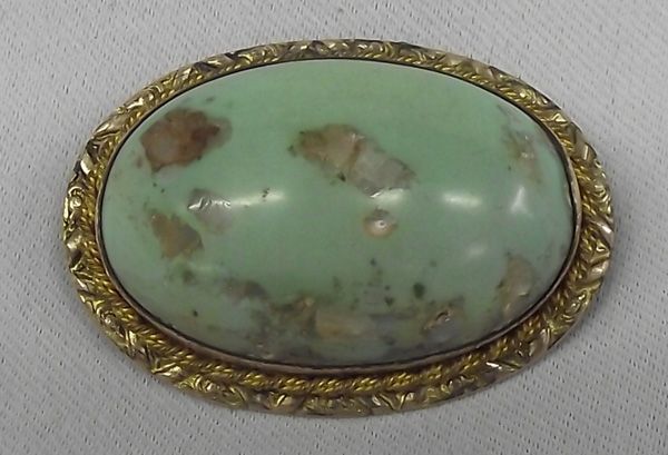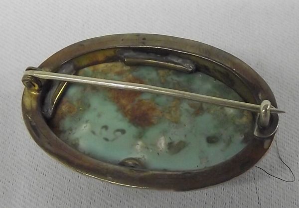 Antique Estate Turquoise Brooch. Large pale blue turquoise nugget with lovely matrix set in a brass color metal. Measures 1-5/8''Lx1-1/4''W.