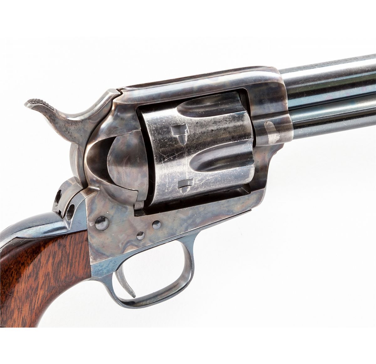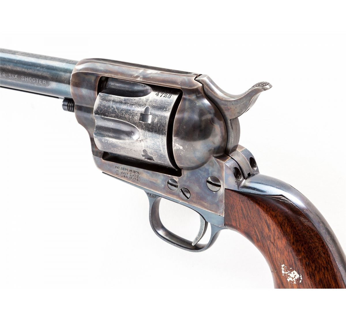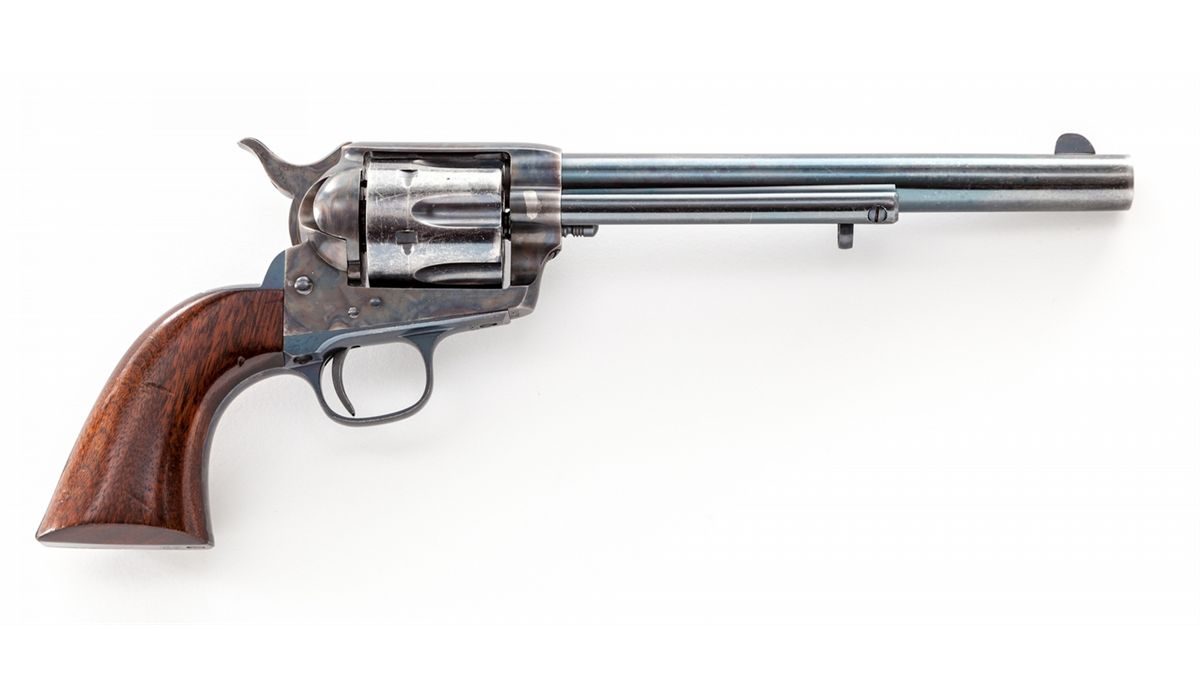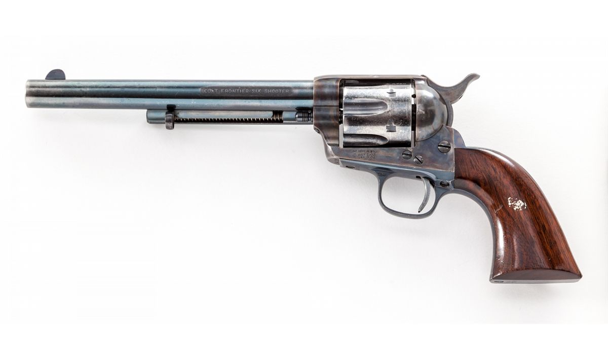 Antique Etched Panel Colt Frontier Six Shooter Single Action Revolver, #64728, .44-40 cal., 7-1/2'' barrel, blue and case hardened finish, one-piece walnut grips. Factory letter states that this serial number was shipped to Col. Premans, March 15, 1881, in a 25-gun shipment. Revolver with all correct features for this time period, correct hammer, donut-shaped ejector rod head with lefet forward triggerguard bow marked ''44 CF'', as is barrel just forward of arbor. Professionally restored retaining approx. 95%-96% finish with most of the losses to cylinder and muzzle. Grips with light dings and scuffs. Action is crisp, bore is bright. Est.: $6,000-$8,000. (Antique)