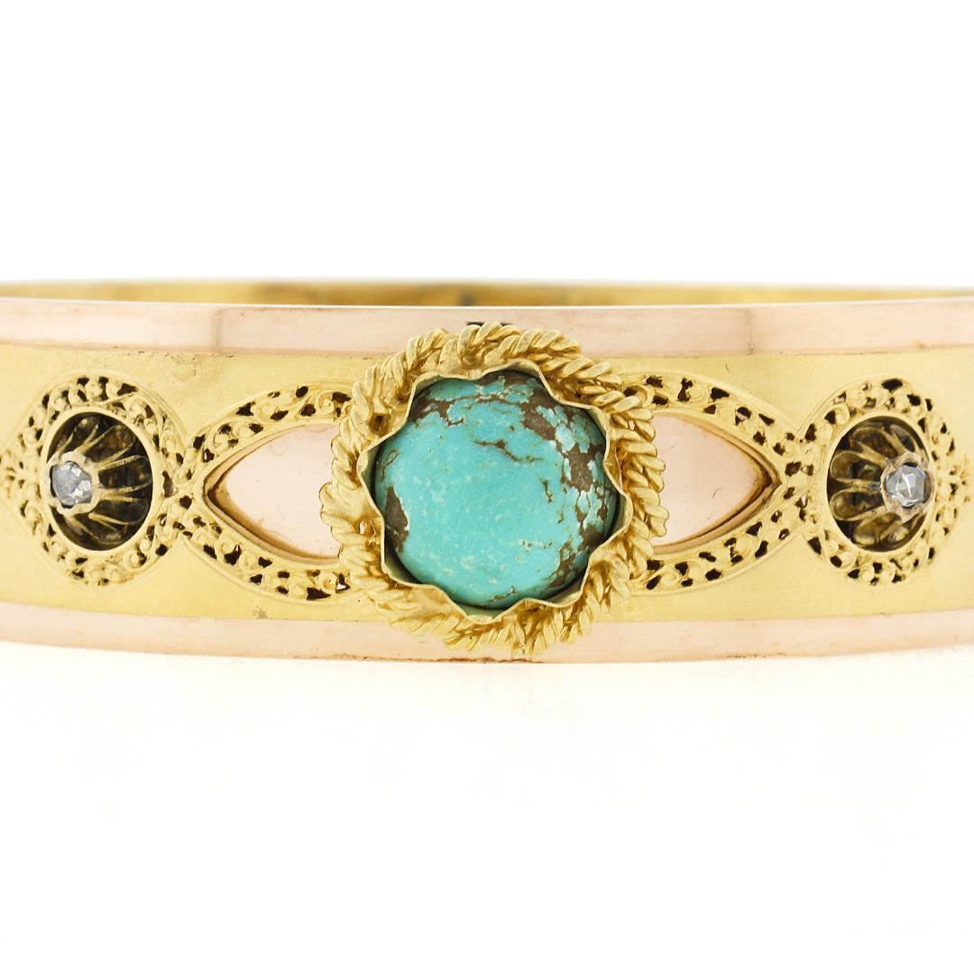 An antique solid 14k yellow gold bangle bracelet, with 1 round natural matrix turquoise (11.8mm), and 2 rose cut natural diamonds (0.10ctw). It weighs a total of 26.75 grams, measures 17.6mm wide, and measures 7 inches in length.