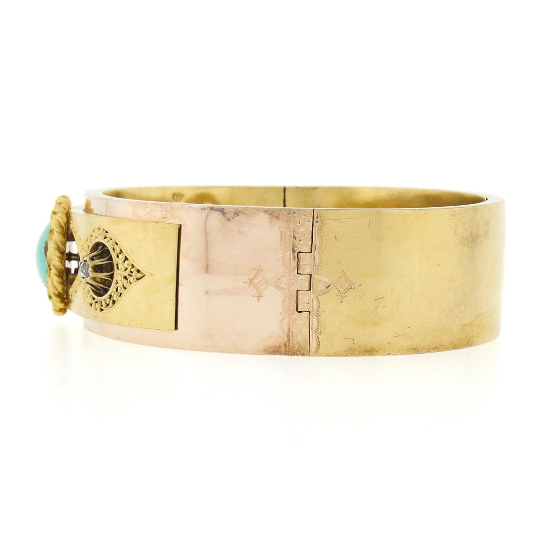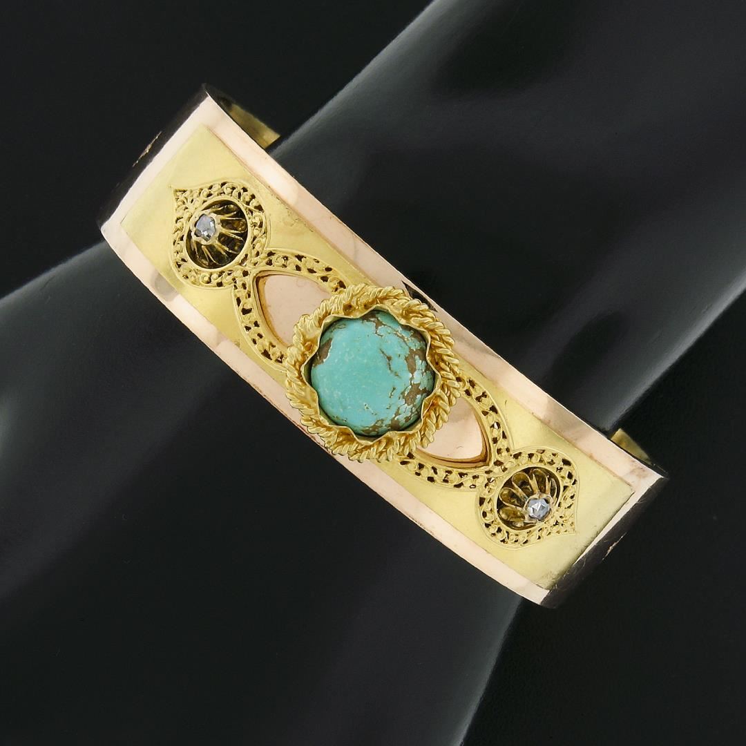 An antique solid 14k yellow gold bangle bracelet, with 1 round natural matrix turquoise (11.8mm), and 2 rose cut natural diamonds (0.10ctw). It weighs a total of 26.75 grams, measures 17.6mm wide, and measures 7 inches in length.
