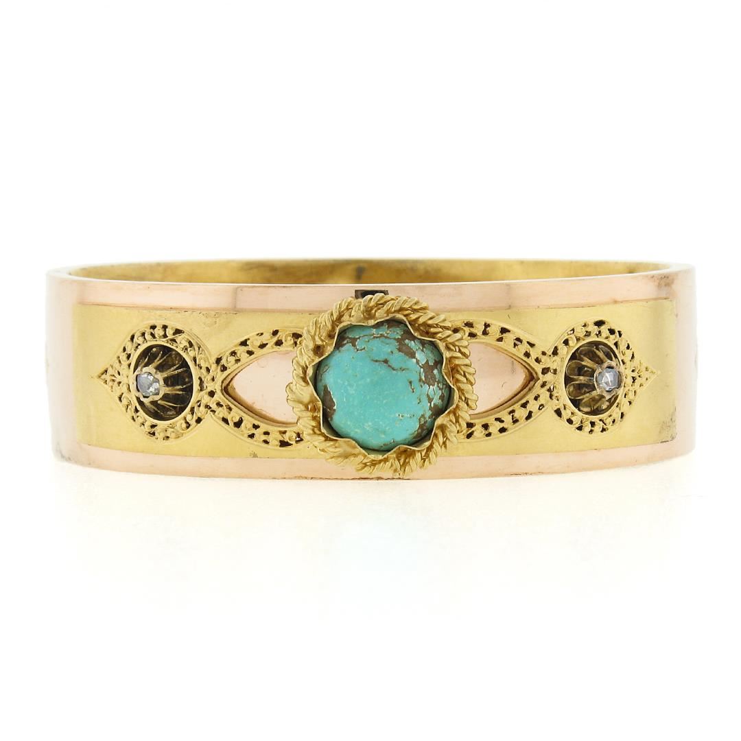 Antique Etruscan Revival 14K Gold Turquoise & Rose Cut Diamond Bangle Bracelet