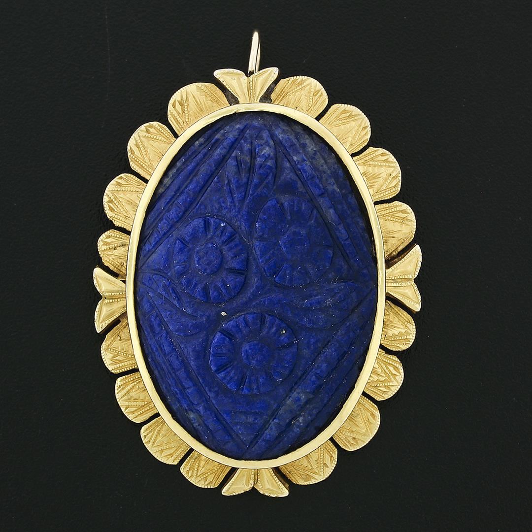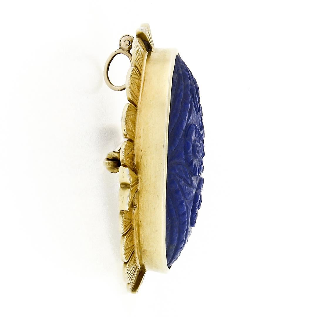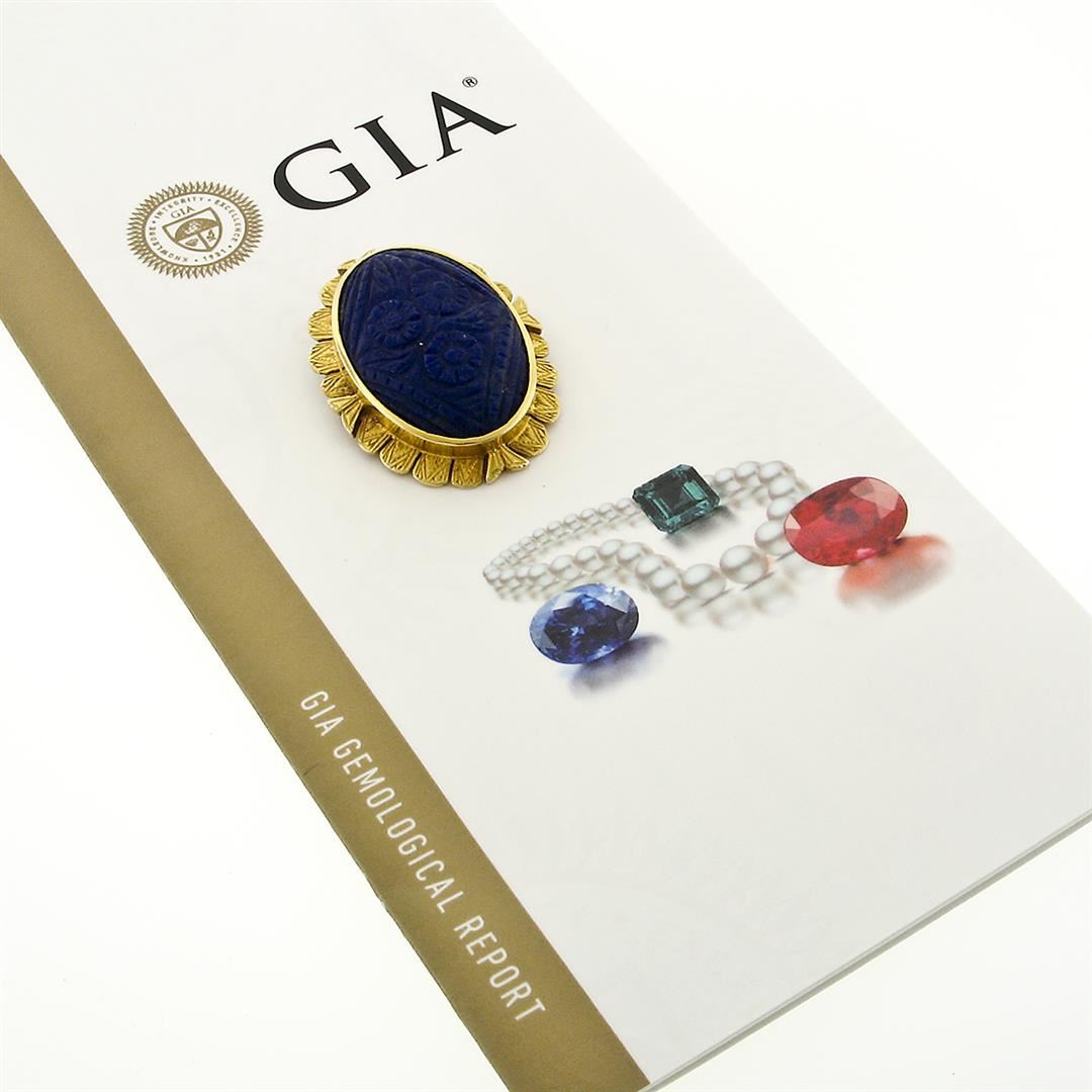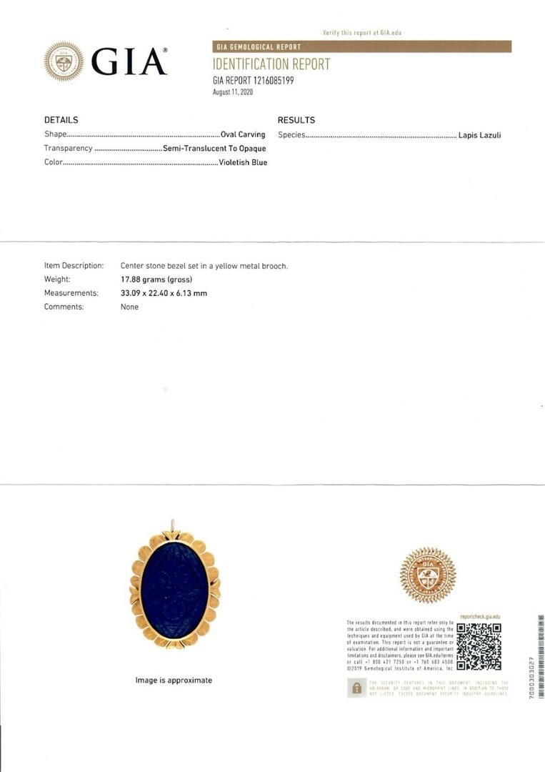 An antique etruscan pendant pin brooch, with 1 Gia certified oval cabochon cut natural lazuli (33.09x22.40mm ). Measures 40.87x31.20mm and weighs a total of 17.88 grams. Comes with all original relevant certifications.