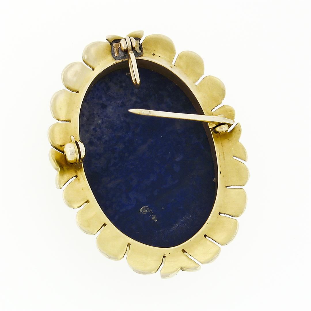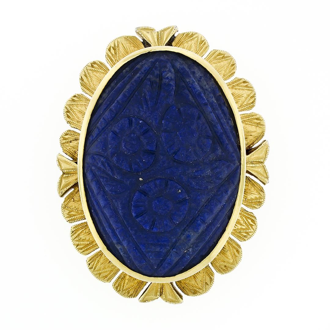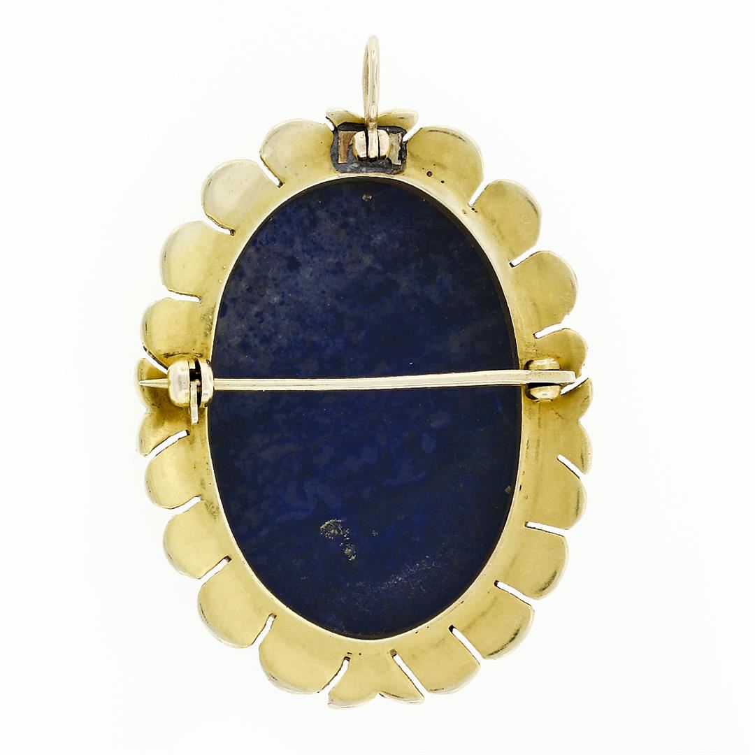 An antique etruscan pendant pin brooch, with 1 Gia certified oval cabochon cut natural lazuli (33.09x22.40mm ). Measures 40.87x31.20mm and weighs a total of 17.88 grams. Comes with all original relevant certifications.