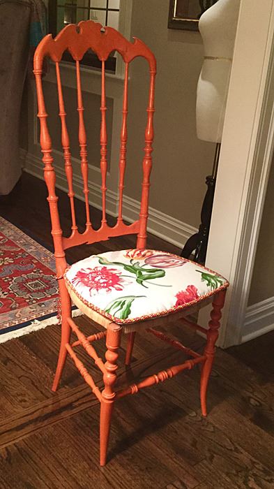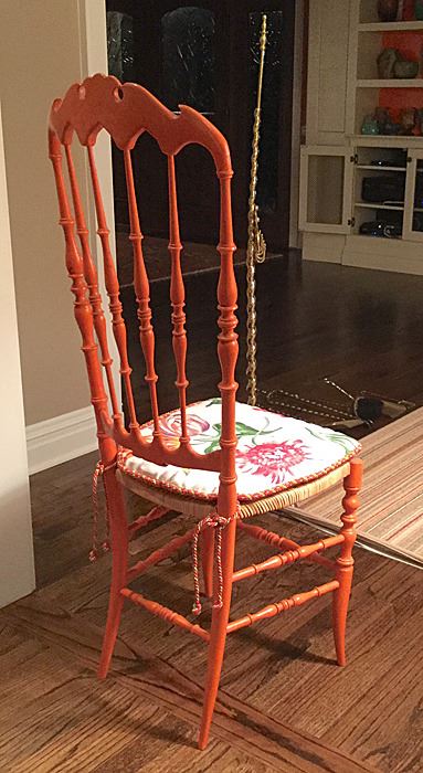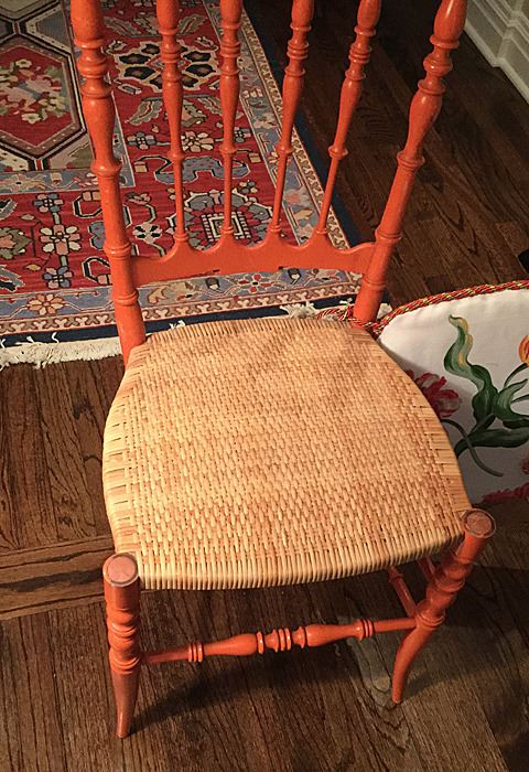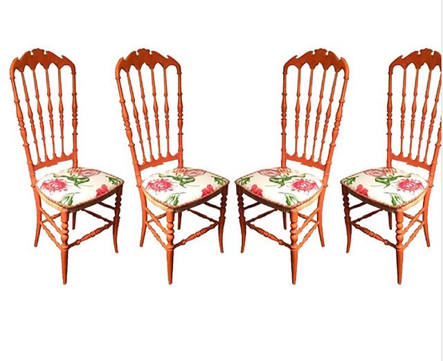 Set of 4 Matching Antique European High Back Cain Seat Chairs. Beautiful, vibrant color with custom made pads. A decorator's choice and excellent addition to home! Each measures approx. Width: 16 inches, Height: 45 inches, Depth: 17 inches. MUST to be picked up or shipped from Port Chester, NY.