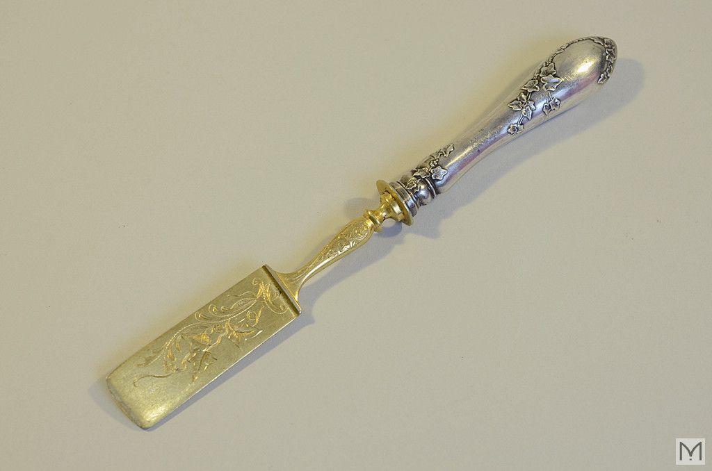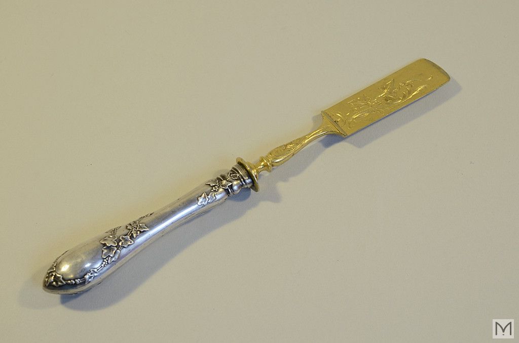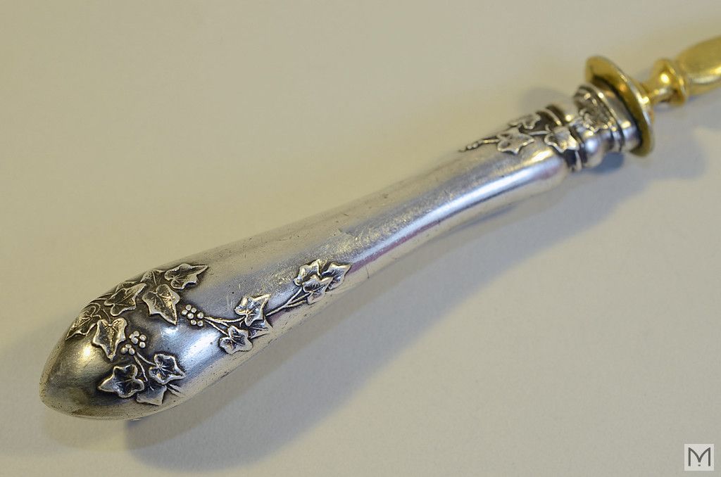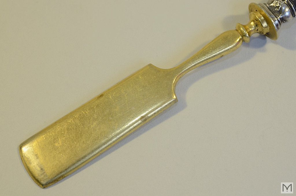 Antique European Condiment Spade - Parcel Gilt with Hallmarked? Silver Handle. Ivy/Grape Leaf Design. Marks are very difficult to decipher, due to location: where spade meets handle in design.