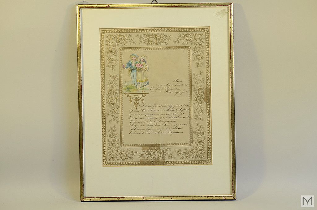 Good antique condition. Frame shows wear, scratches and losses.....left side pulls apart. Letter paper as shown - some adhesive residue - as a result, stains to front along bottom and right-side in border.....small tears to paper noted in these areas and along 'creases'. Figures appear to be a secondary - applied piece of decorative paper. Back of letter shows some small drop-sized areas of discoloration.