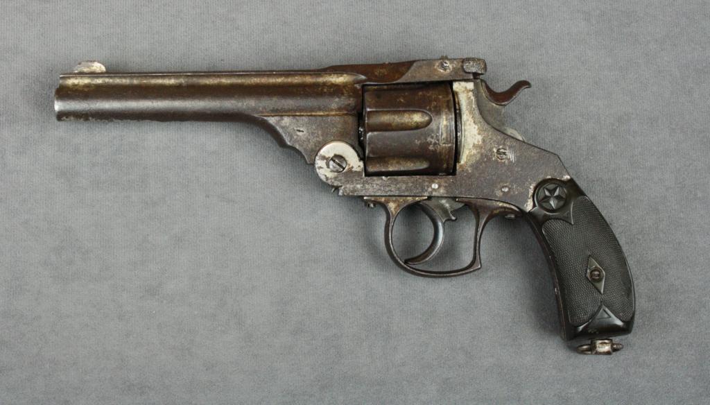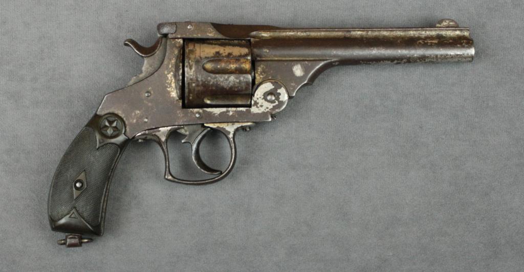 Antique European copy of a Smith & Wesson top break DA revolver, .44 WCF cal., 5-1/2” barrel, nickel finish, checkered black hard rubber grips, #NVSN. This gun is in untouched condition showing approx. 20%original nickel finish with balance gone to a dark brown patina with scattered light to moderate erosion, dark bore, good double action, very good grips, lanyard ring. Est.: $200-$400.