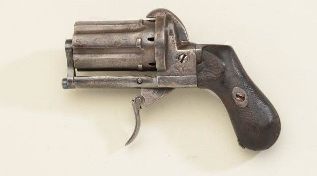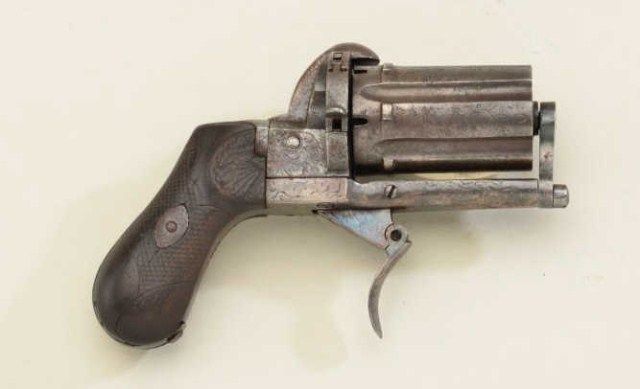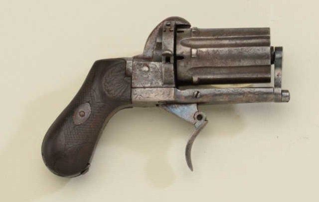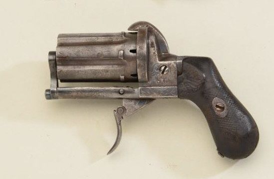 Antique European six shot pinfire pistol with folding trigger, engraved frame and barrel assembly, checkered wood grips, #30. This gun is in overall fair condition showing a grey/brown patina, even wear, dark bores,action needs work; grips are worn with an old crack at the bottom of the right grip. Est.: $400-$800.