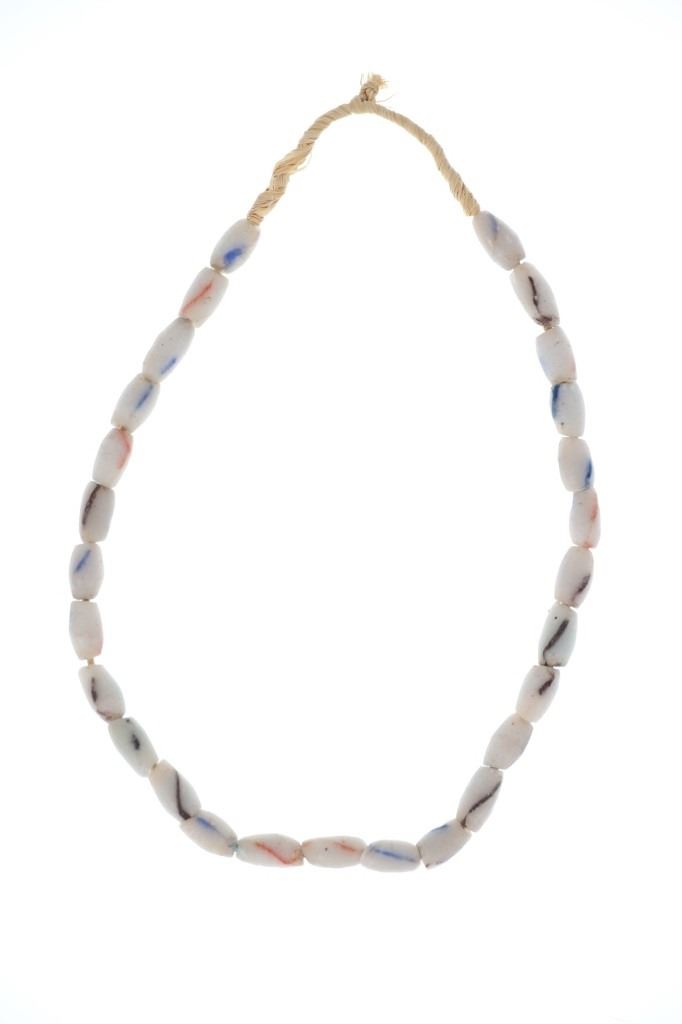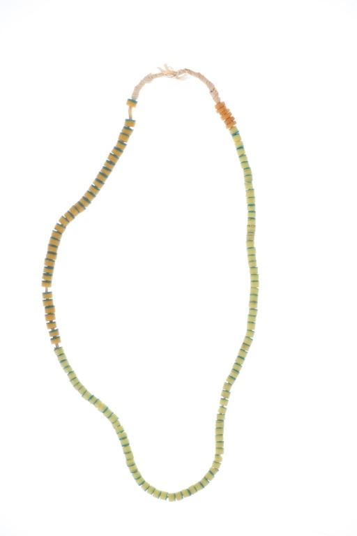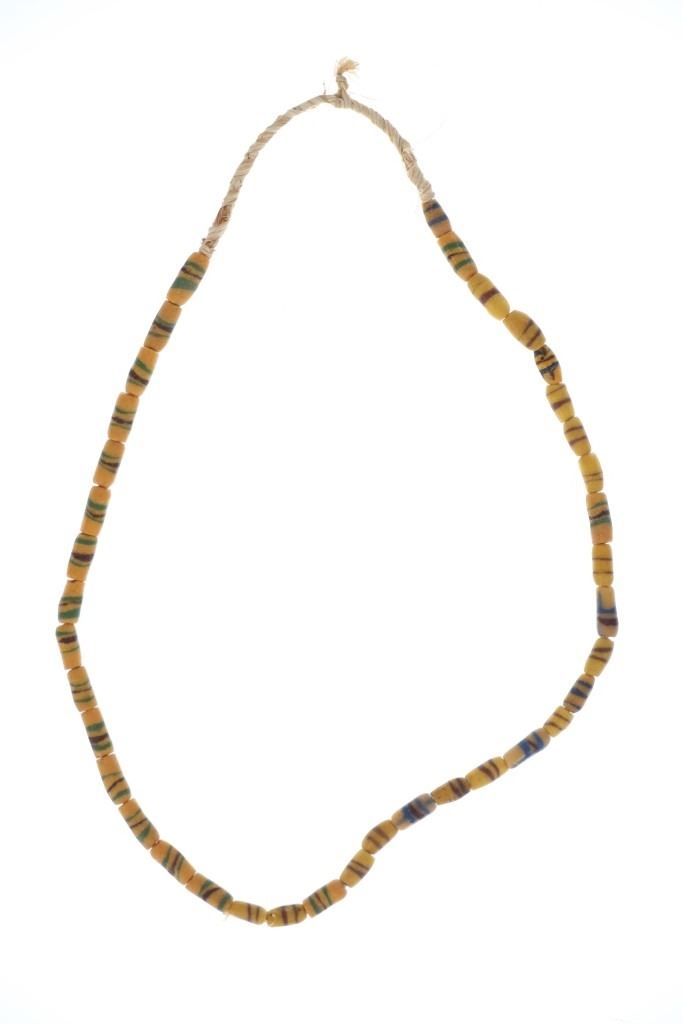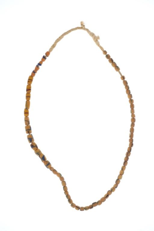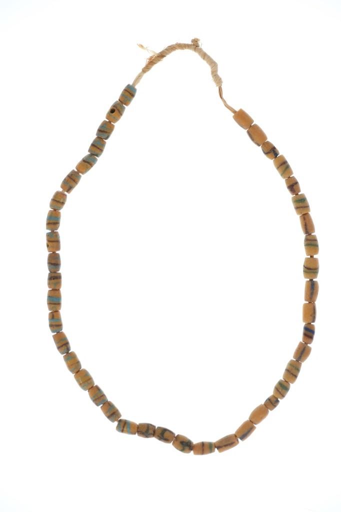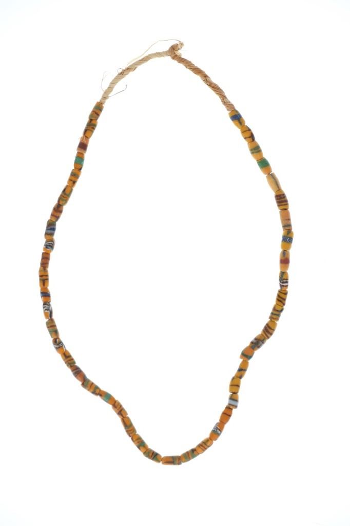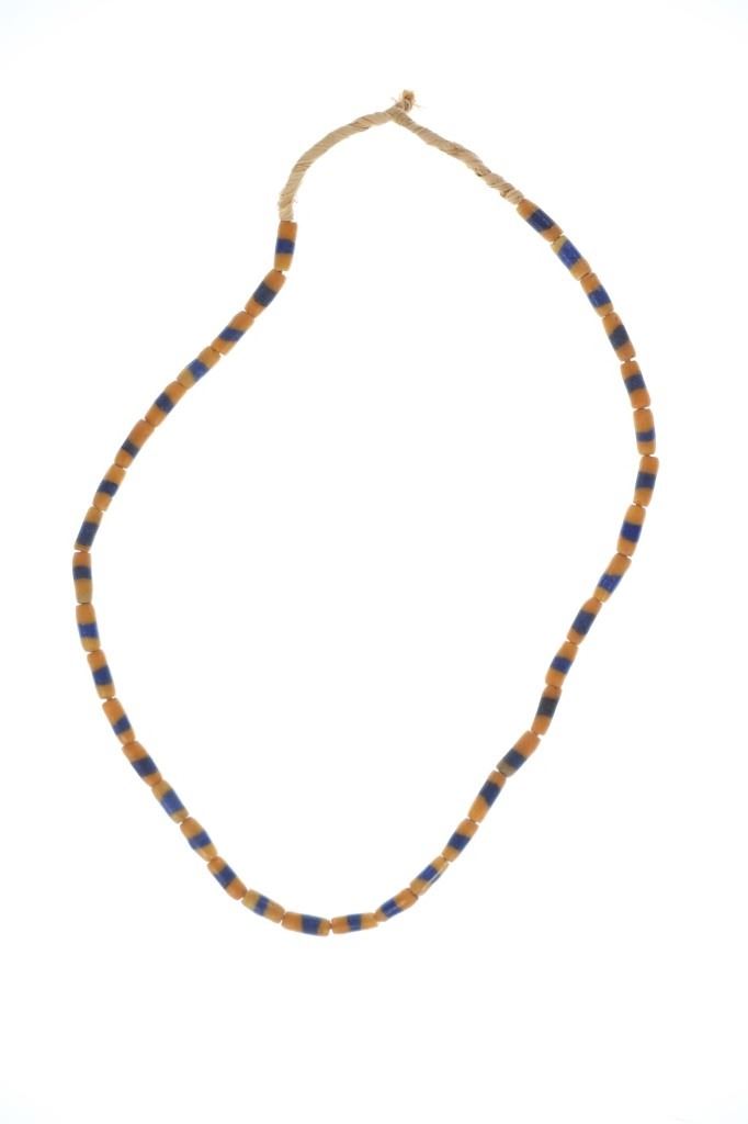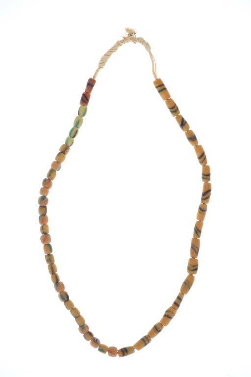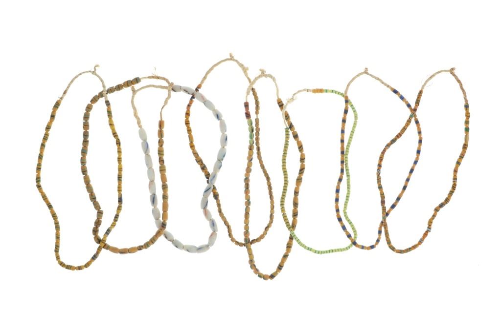 Featured in this lot are eight, Antique Exotic sandcast trade bead necklaces. The technique for creating this style of bead started in Ghana during the 16th century. Very fine pieces of crushed glass are held together with a binding material, such as saliva or gum Arabic, and spread over a grass stem or a bottle glass core. After cooking in the oven, the beads are rolled in other small pieces of glass to create patterns or left plain. The beads on these necklaces vary in size, style and colors. Most show a base color of orange / brown and feature accent colors of blue, light blue, red and green. One necklace features large, light blue sand cast trade beads with accents of blue, purple and green streaks. All of the beads are set on a raffia necklace. They show good condition overall with little wear present and no signs of damage noted. The beads set on the necklaces measure from 1/8" L x 1/4" W to 1" L x 1/2" W, while the necklaces measure 13 1/4" L to 12 5/8" L. They have a collective weight of 14 ounces.