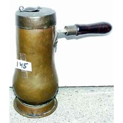 8" tall by 4" base and 5" handle. Antique fat lamp with copper and wood handle. Wick hole in top has intact cover to extinguish lamp.