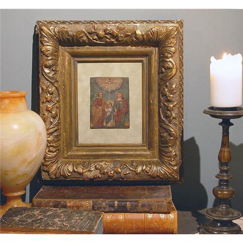 This wonderful antique Spanish devotional painting was discovered in Northern Spain. The work is painted in oil on a piece of tin metal and later framed in an antique gilded frame. The piece is floated on a velvet textured mat. A scene of the Holy Family, the painting style has a wonderful naïve quality. Aged and slightly pitted, the painting is extremely decorative, the primitive charm adding to the works great appeal. The painting depicts the Holy Family, The Christ child at the center, above radiating rays of light, a white Dove symbolizing the Hold Spirit.