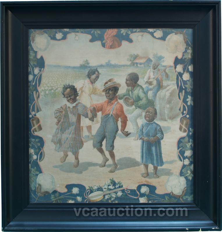 Antique Fabric Pillow Top - an old south colored family dancing & playing a banjo, in frame - 25" x 26"