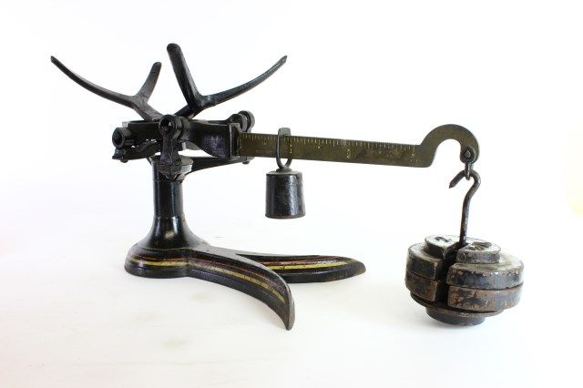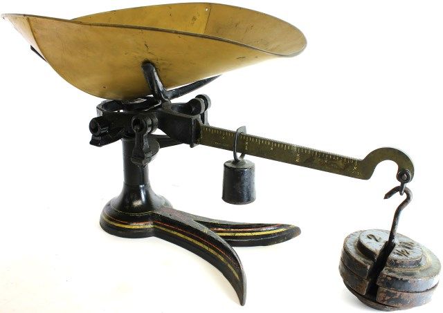 with original paint and graphics on pan and weights, very nice, 19 1/2" long. Est. 250-400