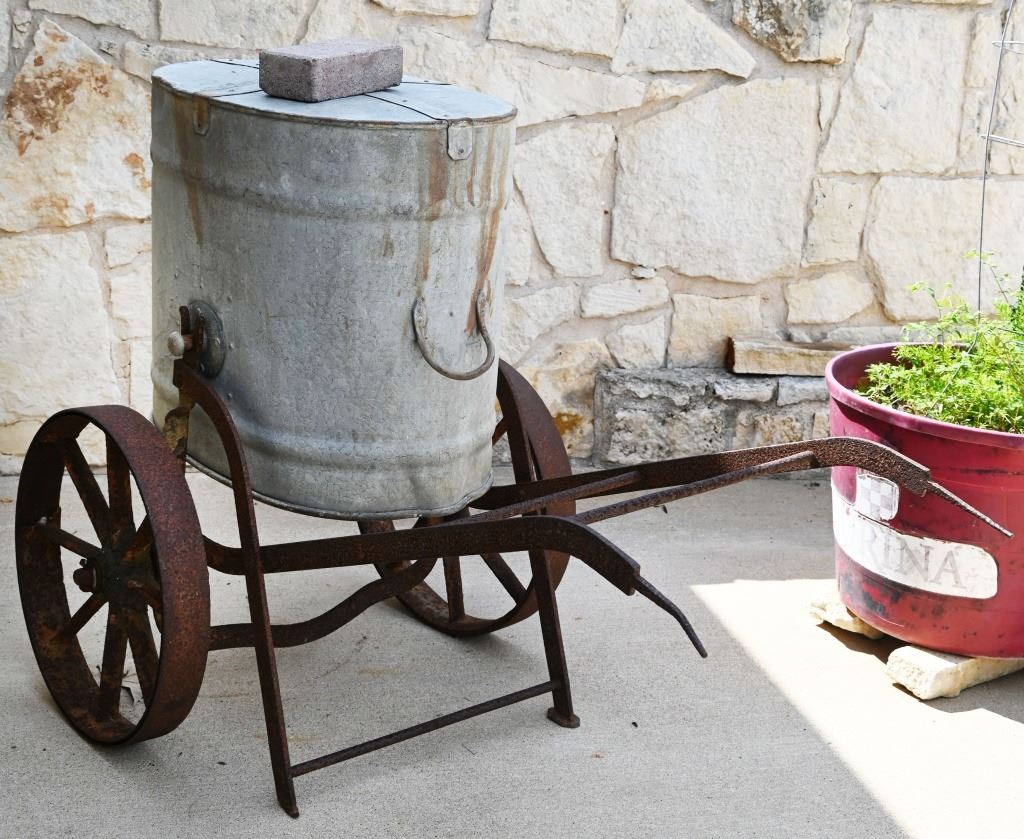 Hand-made iron trailer cart, with galvanized bucket container. Measures 58" L x 32" T x 29" W
