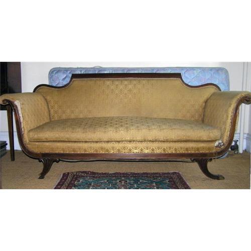 This antique upholstered sofa comes from an impressive early 19th century townhouse on Stuyvesant Street in Manhattan (New York city), just a few doors down from the Stuyvesant-Fish House. Age is unknown, but it's been in the same family since at least the early 20th century. Neo-classical in design, it features a flat toprail with serpentine ends, upholstered arms and curved saber legs ending in lion paw caps. Obviously in need of new upholstery. Overall condition is good, but the end (and cap) of the front left leg is missing. Measures 78" wide, 34" high, 29" deep, and has a seat height of 17". Thanks for visiting. Please let us know if you have any questions or comments.