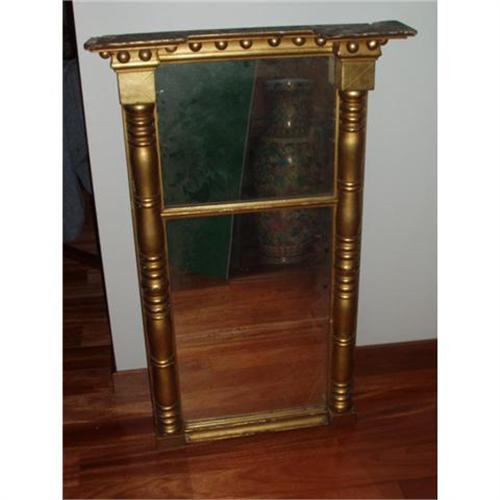 This is an antique Federal gilt split column mirror. It does have some minor chips, some cracks in the top and an 1.5 inch sliver of wood off on the base. Measures 32 inches high and 20 inches wide.