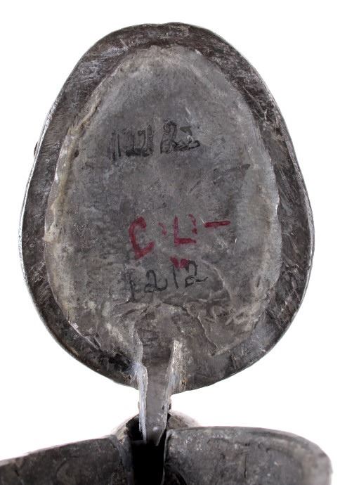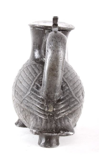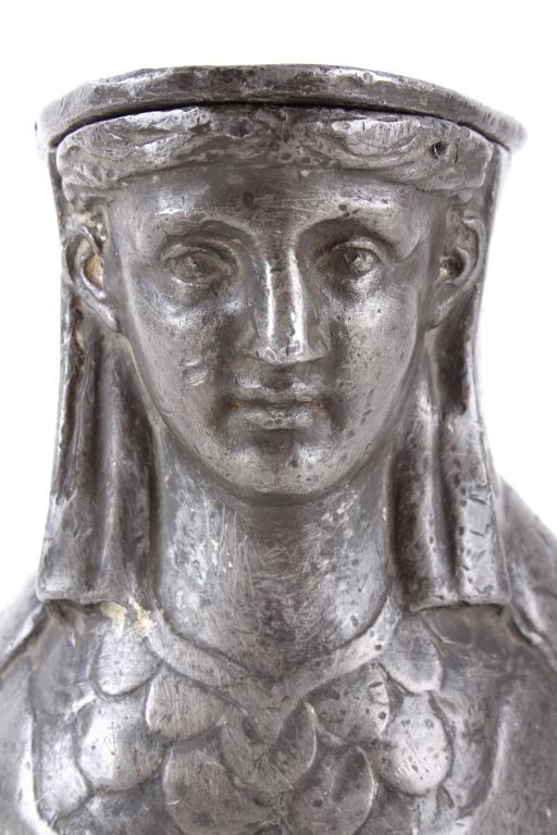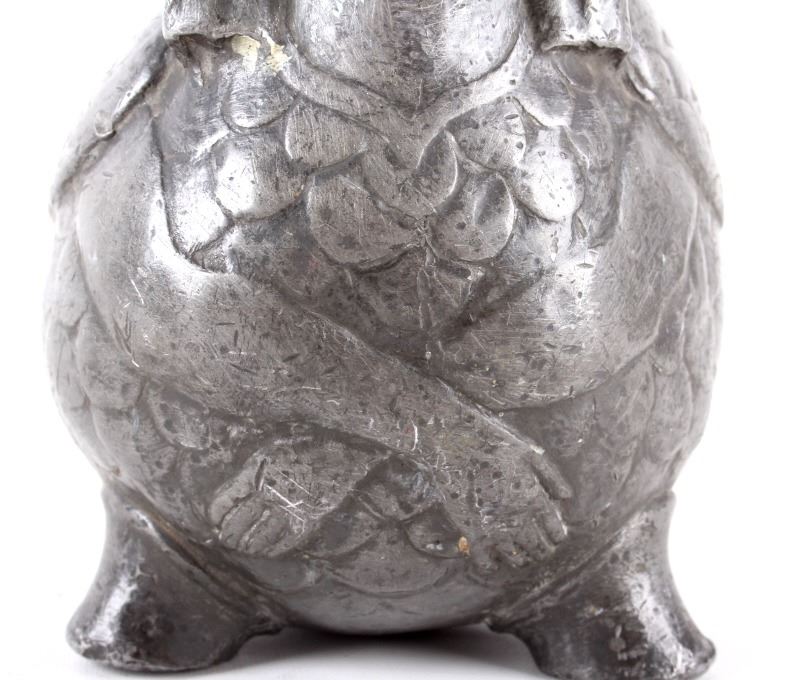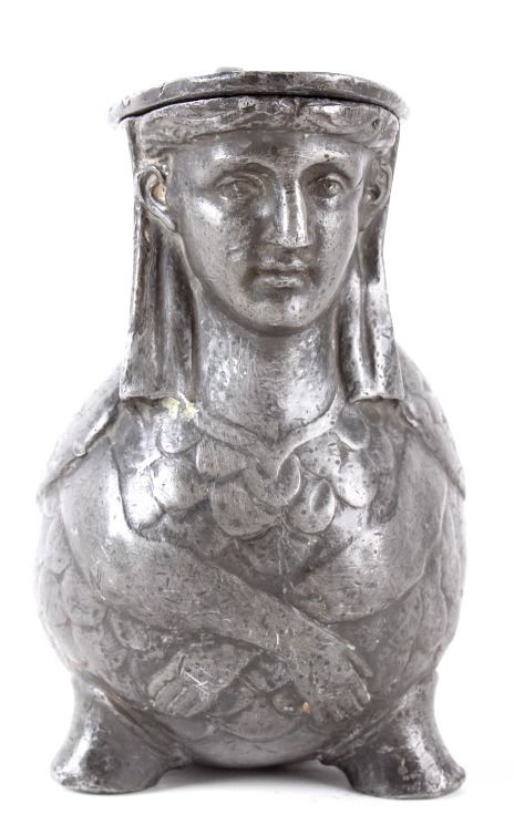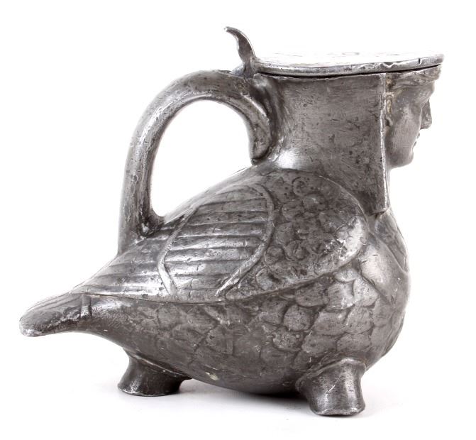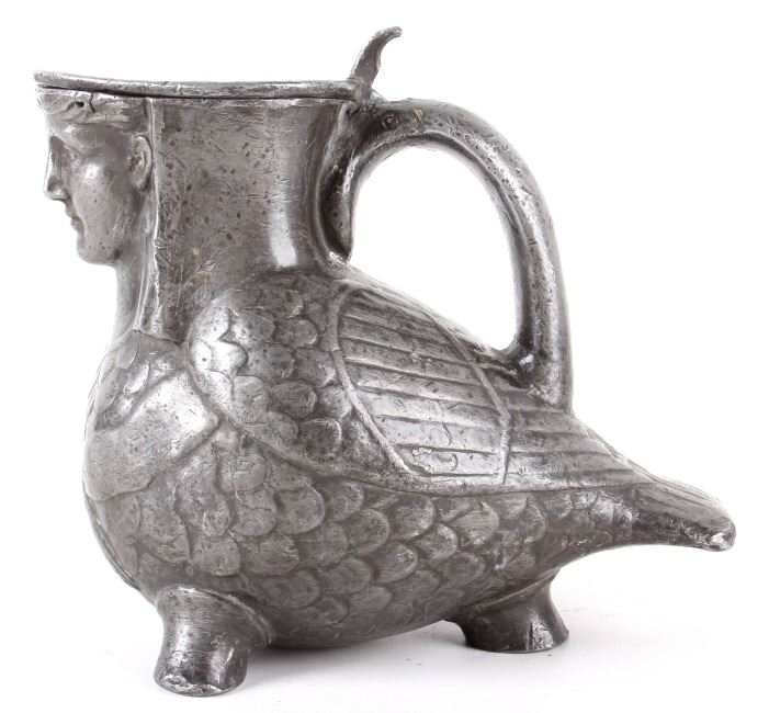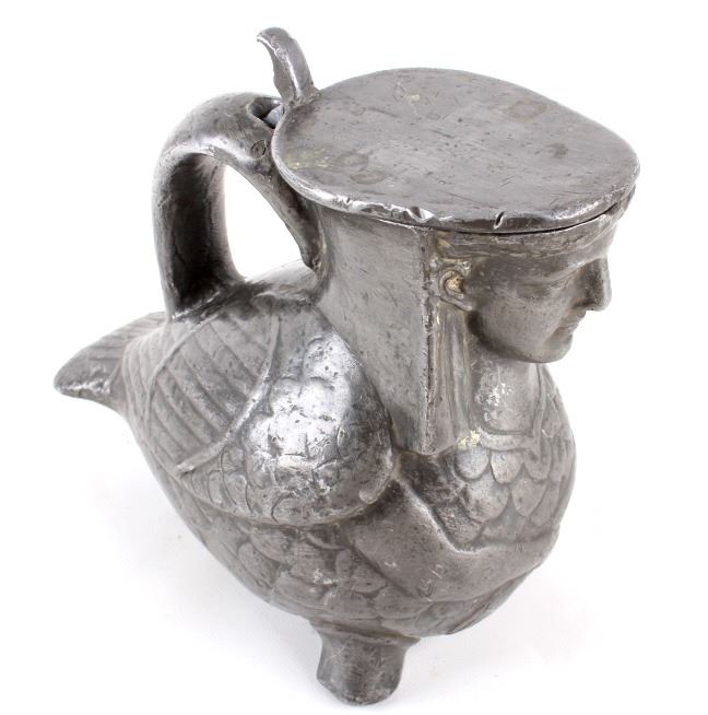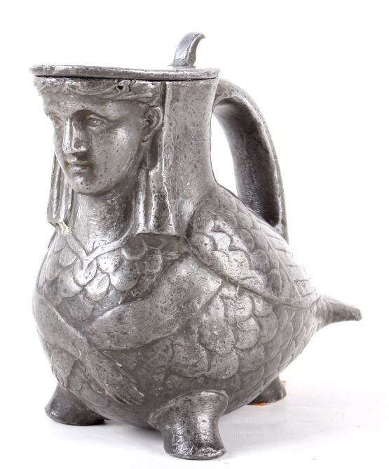 For your consideration is this antique figural tankard based closely on an 1882 claret jug design by Victorian silversmith, Alexander Crichton. The figure is a of a mythological creature called a "Harpy". A Harpy is a half-bird, half-woman creature of Greek mythology, often portrayed as a woman with bird wings and legs. The figure here has a neo-classical woman's face and arms with the body and wings of a bird. The figure is supported by three short legs. The head has a hinged cover with a thumb-piece. Underneath the cover are what appear to be museum markings which include numbers and initials. The tankard has substantial heft and is in very good condition; it measures 8.5" long x 6.25" tall x 4.5" wide.