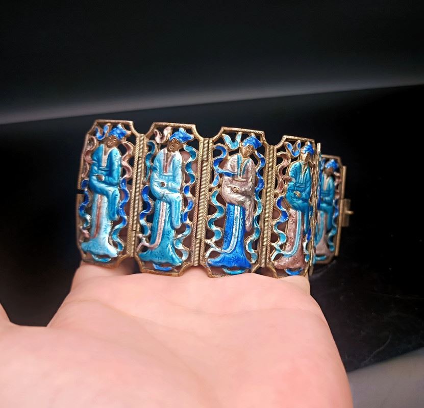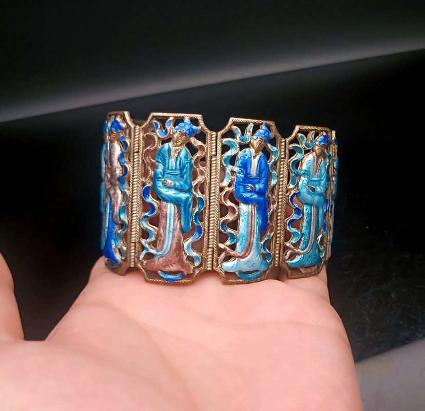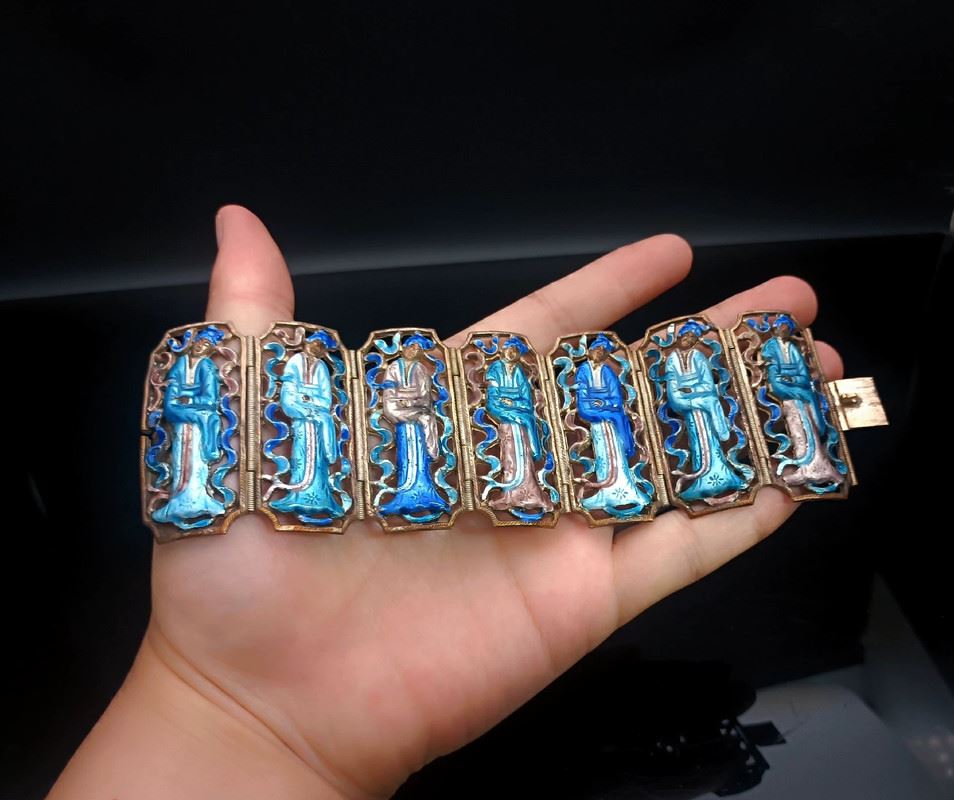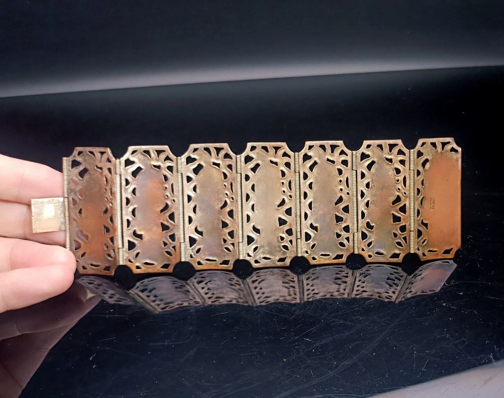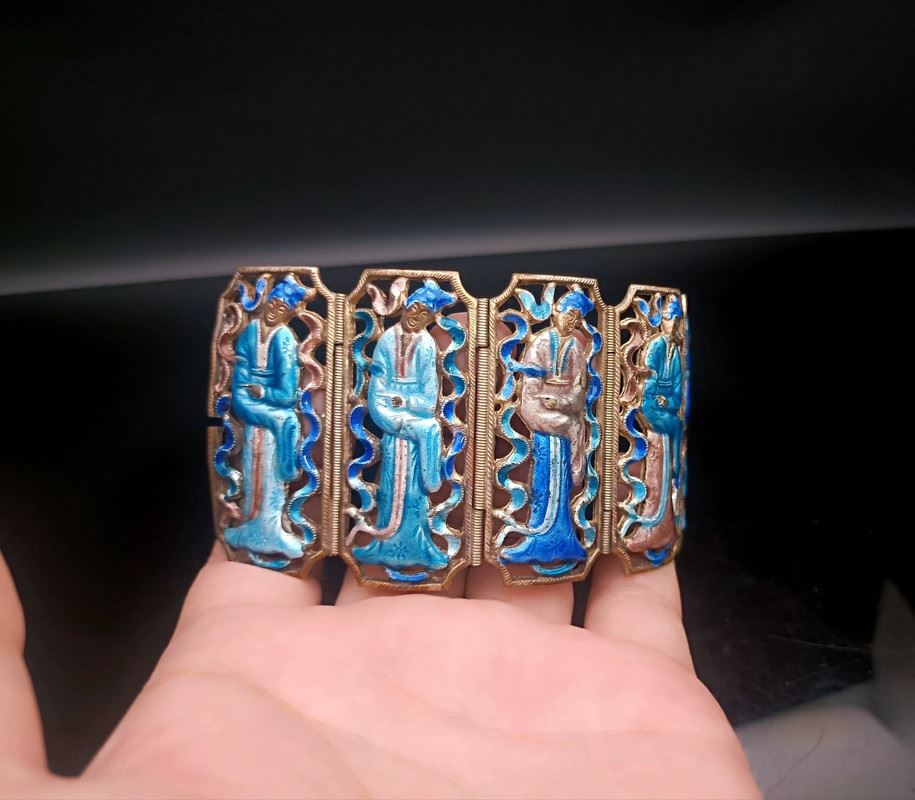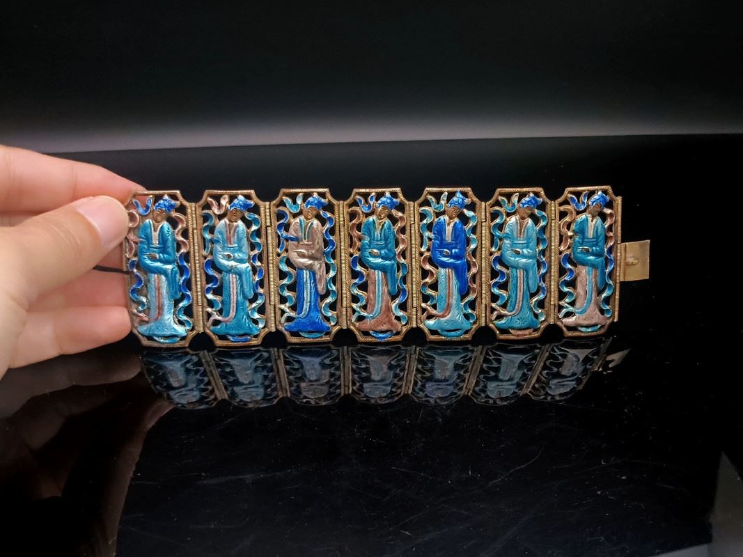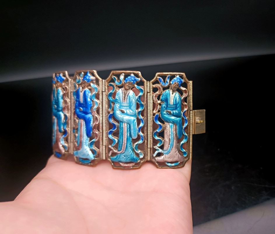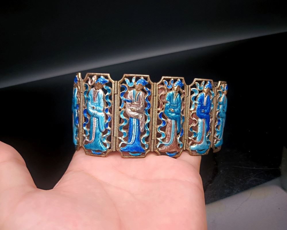This antique filigree enamel bracelet is renowned for its exquisite craftsmanship and vibrant colors. Each segment of the bracelet is adorned with brightly colored enamel patterns, showcasing intricate detailing. The traditional filigree technique is employed, with the metal frame and enamel complementing each other to create a unique artistic effect. The overall blue and brown tones harmonize beautifully, adding a rich vintage feel, perfect for collectors who appreciate retro art styles.