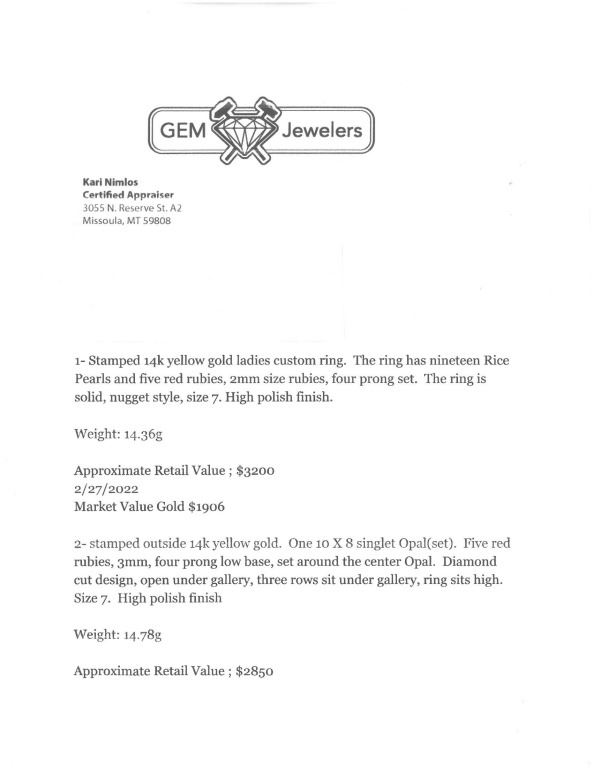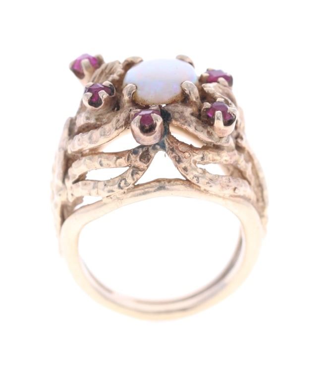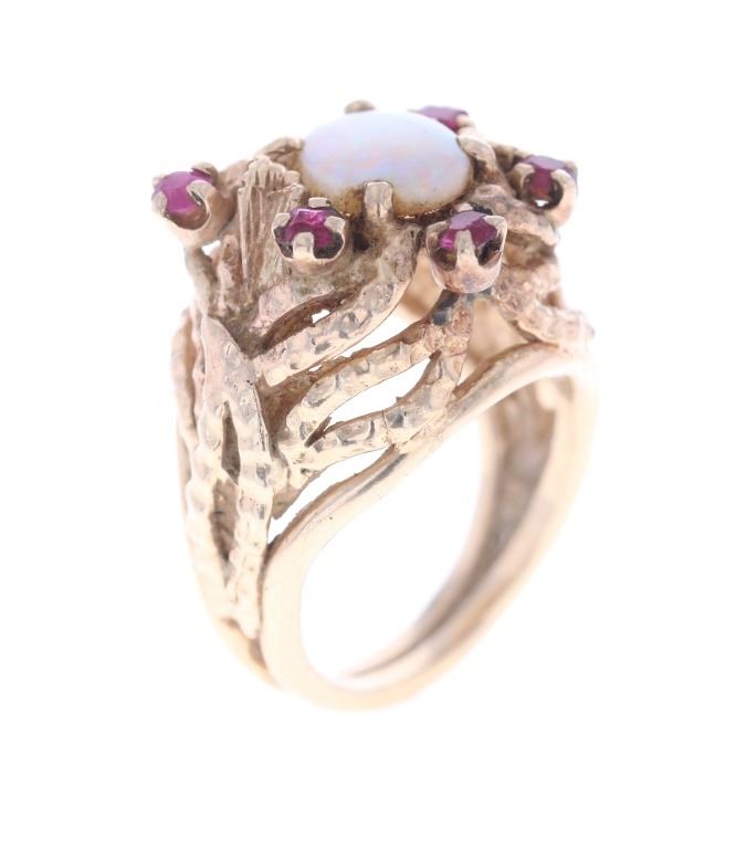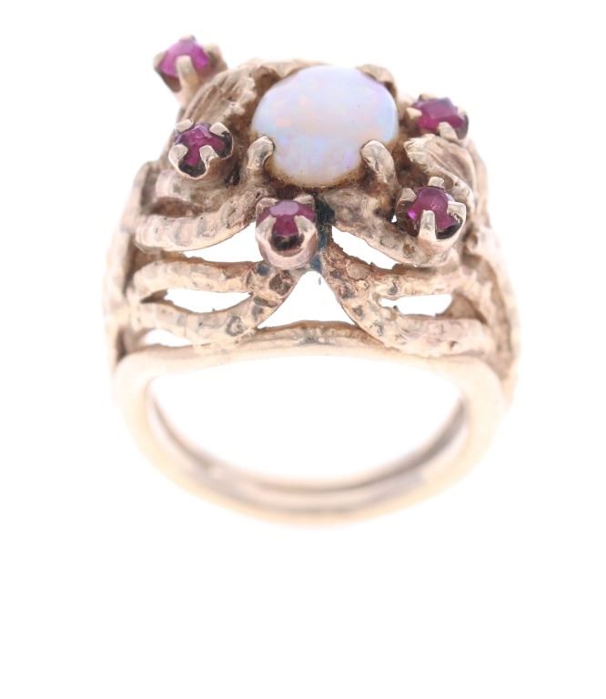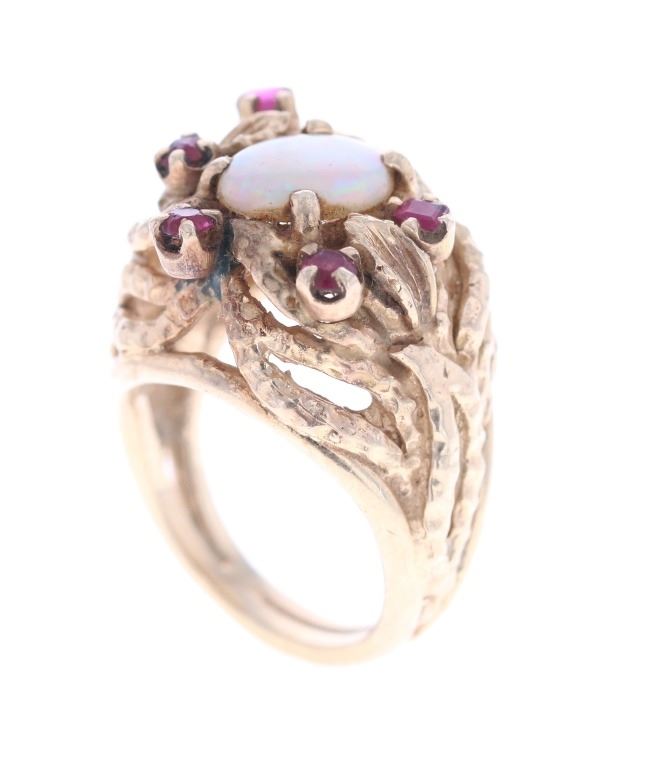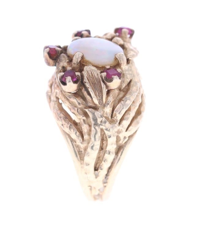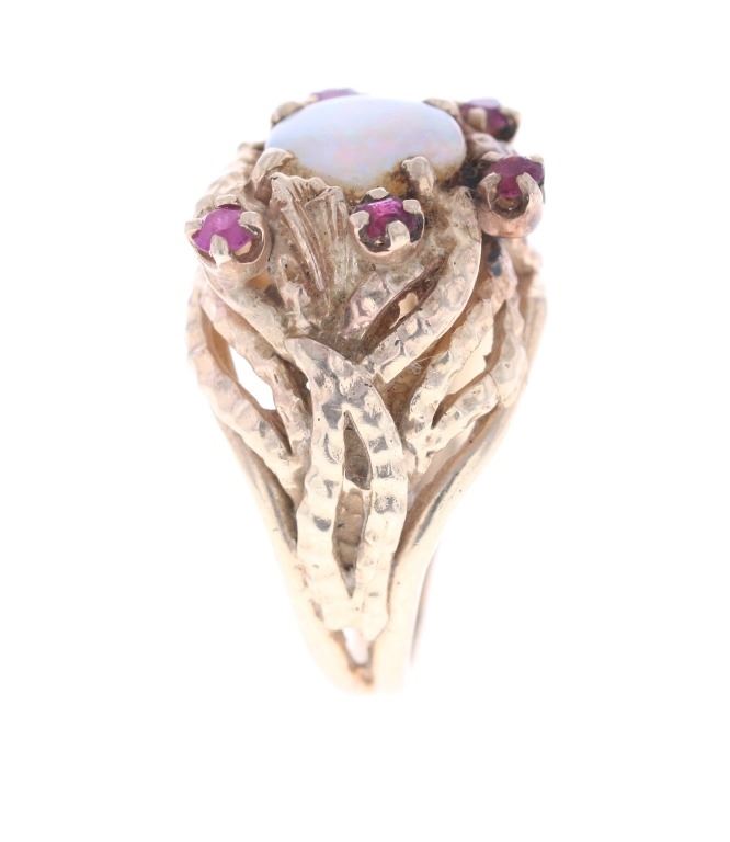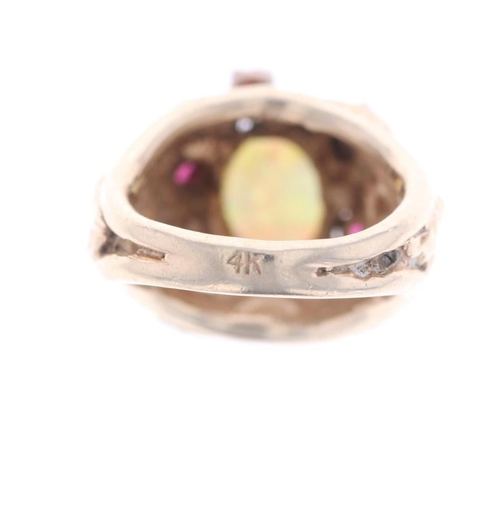 Featured in this lot is this antique fire opal ruby and 14k yellow gold ring circa 1940's. The ring features a wonderfully and professionally crafted 14k gold construction with a '14k' stamp on the outside of the ring band and features a tooled raised vine open lattice to the setting. The centerstone is oval cut fire opal cabochon with approximate measurements of 9.9mm x 8.03mm x 1.62mm (The stone was measured in setting) and shows a approximate weight of .47 carats (the weight was calculated with online calculator) and shows beautiful colors of cream, pink, purple, and green and shows a beautiful luster with a good cut grade. The center stone is decorated with five red rubies in four prong setting with an approximate measurements of 2.98mm x 2.98mm x 1.66mm for each stone (the stones were measured in the setting) and show an approximate weight of 0.5 carats for the collective weight (The weight was calculated from an online calculator) and shows deep red coloration with a beautiful luster and good cut grade. The condition of this ring is good with no obvious signs of damage and in good overall condition. The overall measurements of this ring are 1 1/8" x 5/8" x 7/8" and shows a ring size of US 7 1/4. The collective weight of this ring is 14.7g. Amazing heavy piece.