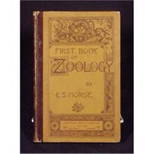 The First Book of Zoology by E.S. Morse. This is a fabulous little book containing a wealth of information. The book is for those who wish to gain a general knowledge of the structure, habits, modes of growth and other leading features concerning the common animals of the country. Pub: American Book Company. Small duodecimo. The cover has, what feels like, a leather spine but it isn?t. It is fabulously decorative with a gold gilt stamped snail and lettering. The back and front cover are in a nicely contrasting pumpkin color with numerous pictorials including a snake, a squirrel and a crab. 190pp. + ads. Many textual illustrations. Second edition nd (the first edition had originally appeared in 1875). This textbook for young people is surprisingly scarce. There is a pos and date on the ffep (dated ? Dec 25, 1905). There is some edge wear to the cover and to the head and tail of the spine (shelf wear). The pages have some foxing but the binding is tight and clean.