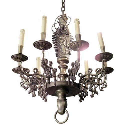 This antique cast bronze chandelier is Flemish and believed to date from circa 1880. Electrified sometime in the 20th century and in working condition. (We can't confirm the working condition of all sockets.) Measures 24" wide by 27" high. Also has about 3 feet of chain plus its original ceiling cap (not pictured).