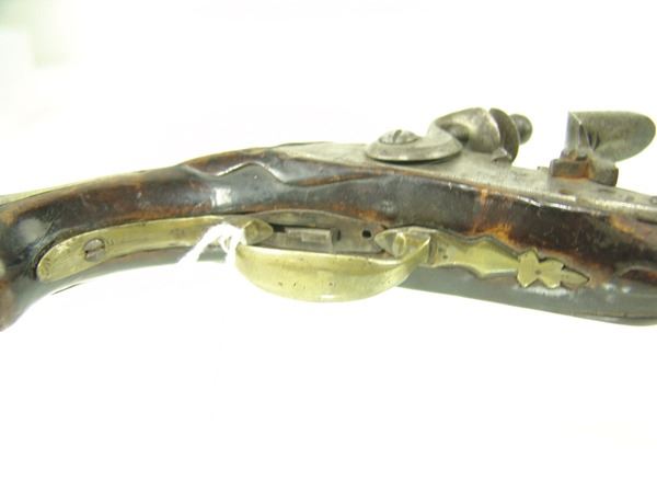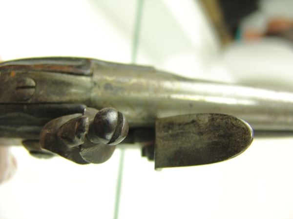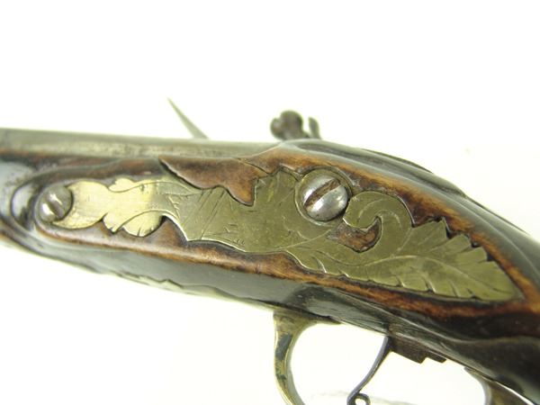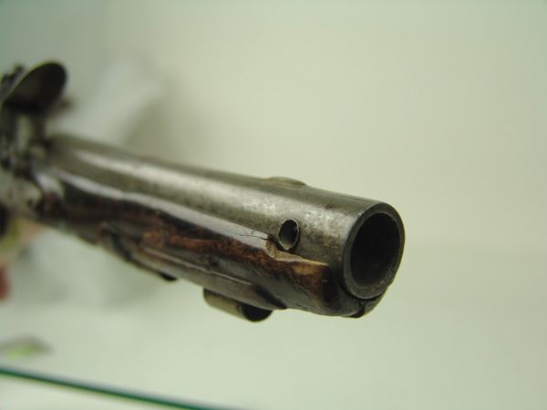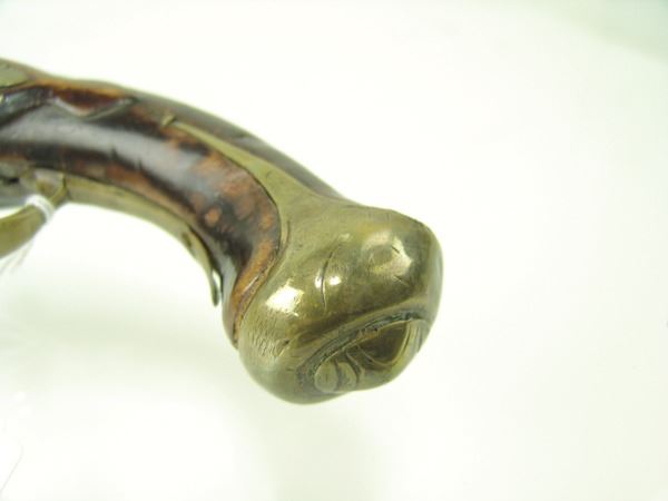 Late 1800s 11" Very old muzzle loader in .50+ cal. with 6-1/2" round barrel, etched brass inlays, and carved stock. Poor condition. Cracked stock, some missing parts. No S/N.