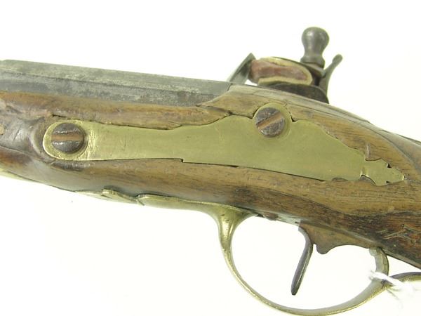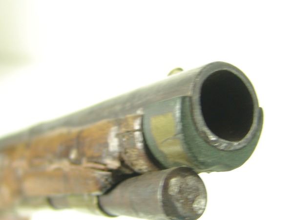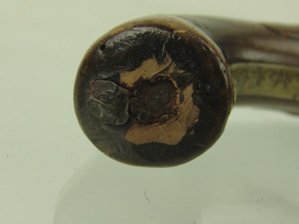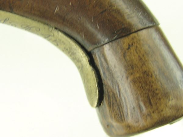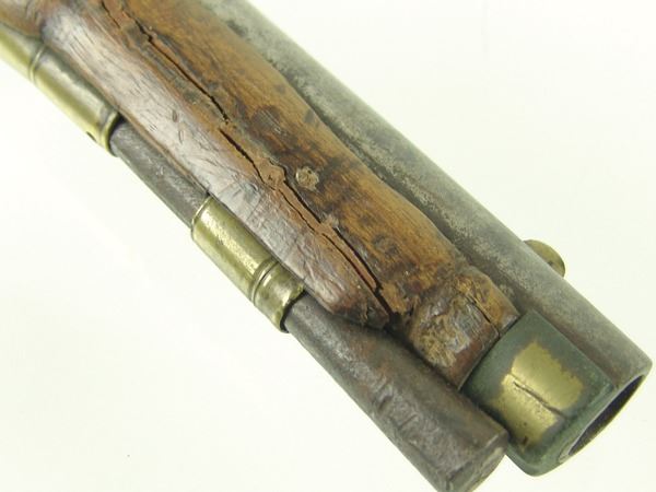 Late 1800s 12-1/2" Very old muzzle loader with 7", octagon to round barrel, and fancy brass inlays and hardware. Fair condition. Stock broken in places. 50+ cal. No S/N
