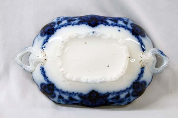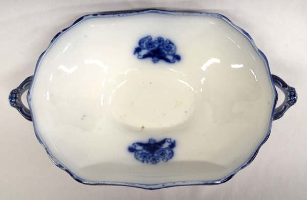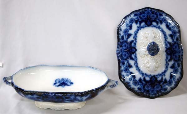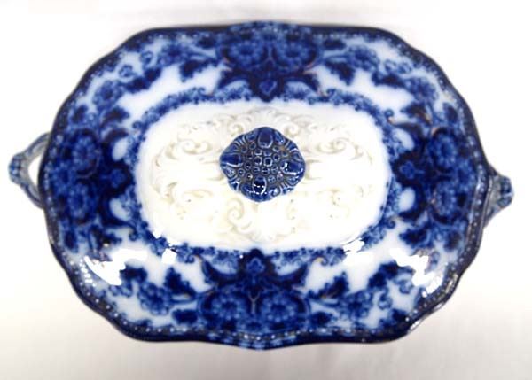 Antique Flow Blue Covered Dish, measures 5''H x 12''L x 7.5''W, some faded gold gilt, has the number 3 on the bottom