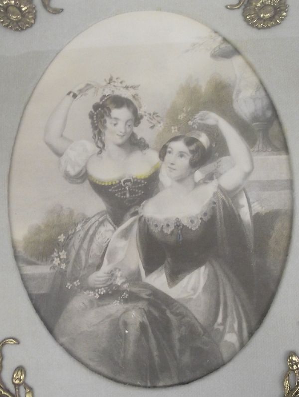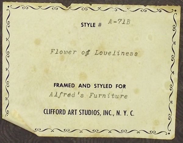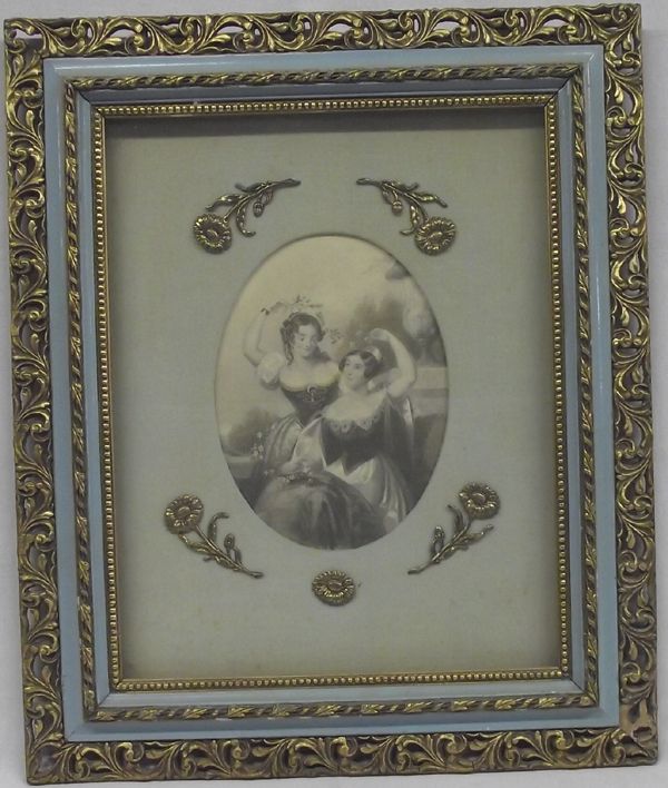 From the Proctor Collection. This striking Antique Framed Victorian Print is in a fancy Gold Gilt Filigree frame and is titled ''Flower of Loveliness''. This oval print has a visual measurement of approx. 8'' x 6.5'' and is matted and surrounded by 5 Gilt flowers.