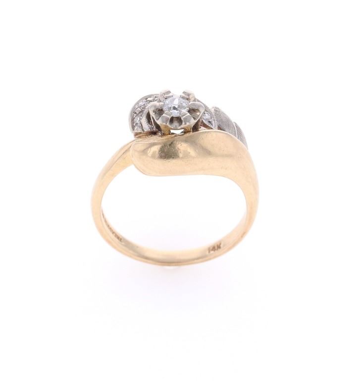 Featured in this lot is this Antique freeform diamond and 14k two tone gold ring. The ring features a wonderfully and professionally crafted from Treasureland (Treasure Land) and is marked on the bottom of the ring with their hallmark and a 14k gold stamp. Treasureland is said to be an old mid-to-late 20th Century Montana Jewelry shop. The ring features a freeform design to the ring band with an accent of 14k white gold where a total of six Old European cut diamonds are housed with one large central diamond and five smaller diamonds are shown on the shorter ledge of the accent. The condition of this ring is good with no obvious signs of damage and shows good overall condition. The measurements of this ring is 1" x 3/4" x 3/8" and the ring size is US 6 1/2. The collective weight of this ring is 4.6g. The approximate diamond weight is .105cts.