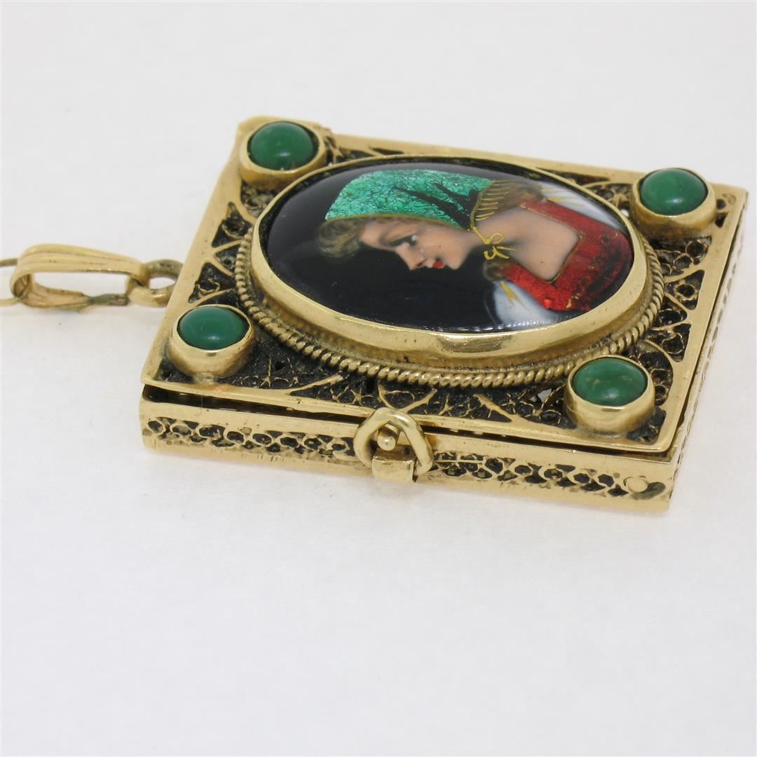 Antique French 14k Gold Turquoise Enamel Portrait Hinged Locket Pendant Necklace. Please see photos and description for all available information. An antique french solid 14k yellow gold locket pendant necklace, featuring 1 oval shape enamel portrait, sur
