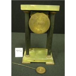 Antique French alabaster Portico clock. 19th Century. Movement mounted in brass drum, pendulum may not be original. Porcelain dial with snake-like hands; stamped brass bezel, fluted metal columns. 8" tall, 4-3/8" wide and 3-1/2" deep. Condition: Loose ormolu mount, no key. Corners nicked.