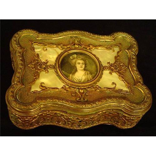 Circa. 1850 Has original key. Exquisite top is mounted in bronze filigree. Inlaid mother of pearl with portrait. Original patina. In very good condition.