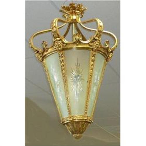 </font></strong>This is an exquisite dore' bronze Antique French Lantern Chandelier Fixture with fine castings and etched glass panels. It is wired for USA use and ready to be hung.</font>